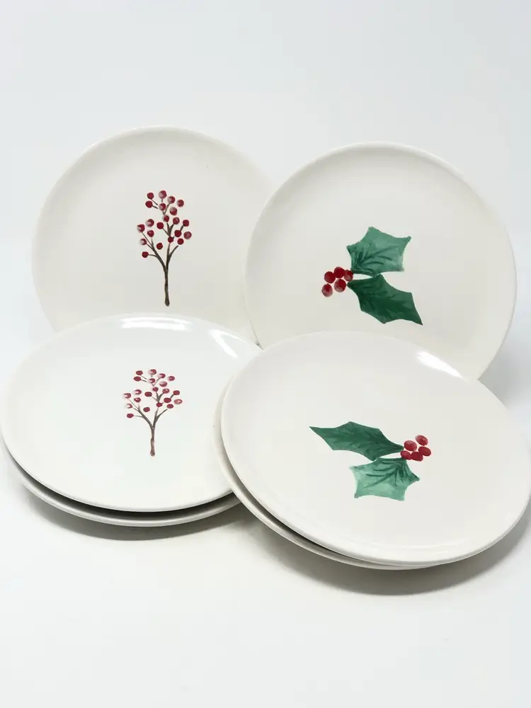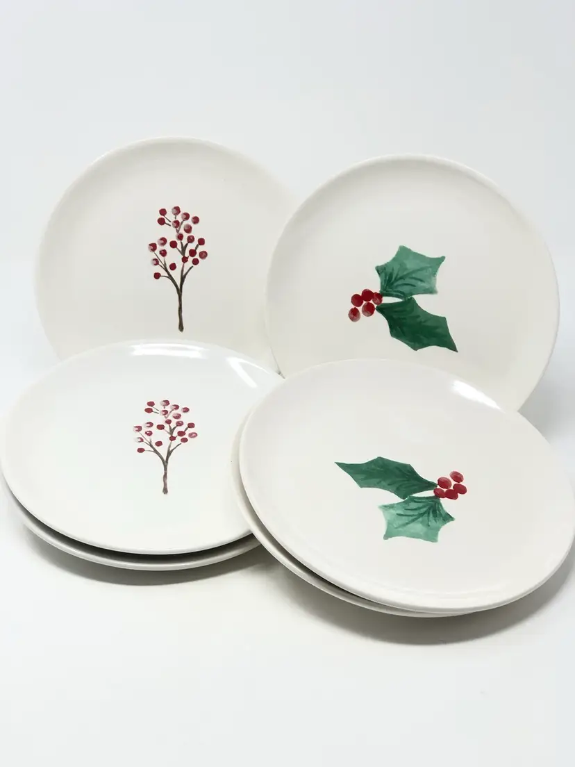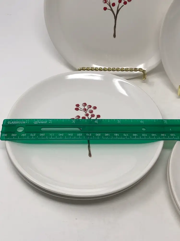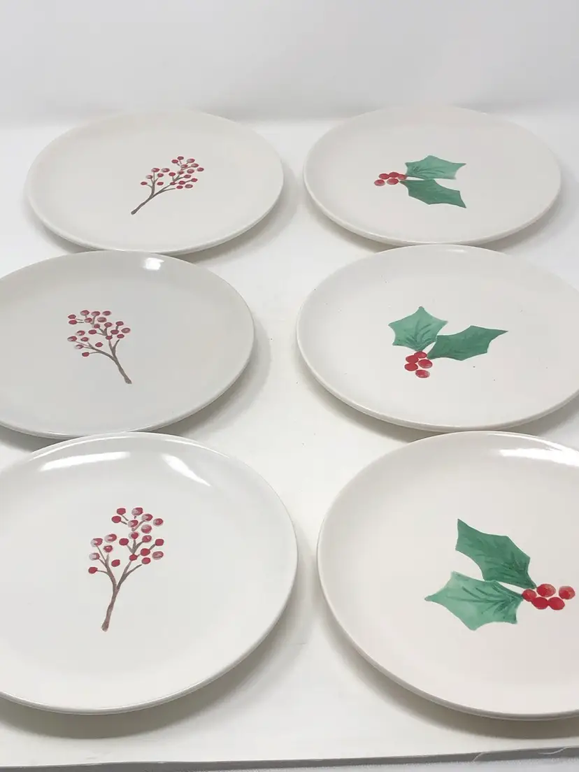 7" white plates featuring holly and berries on a stem. Dolly Holiday Home Collection with original labels