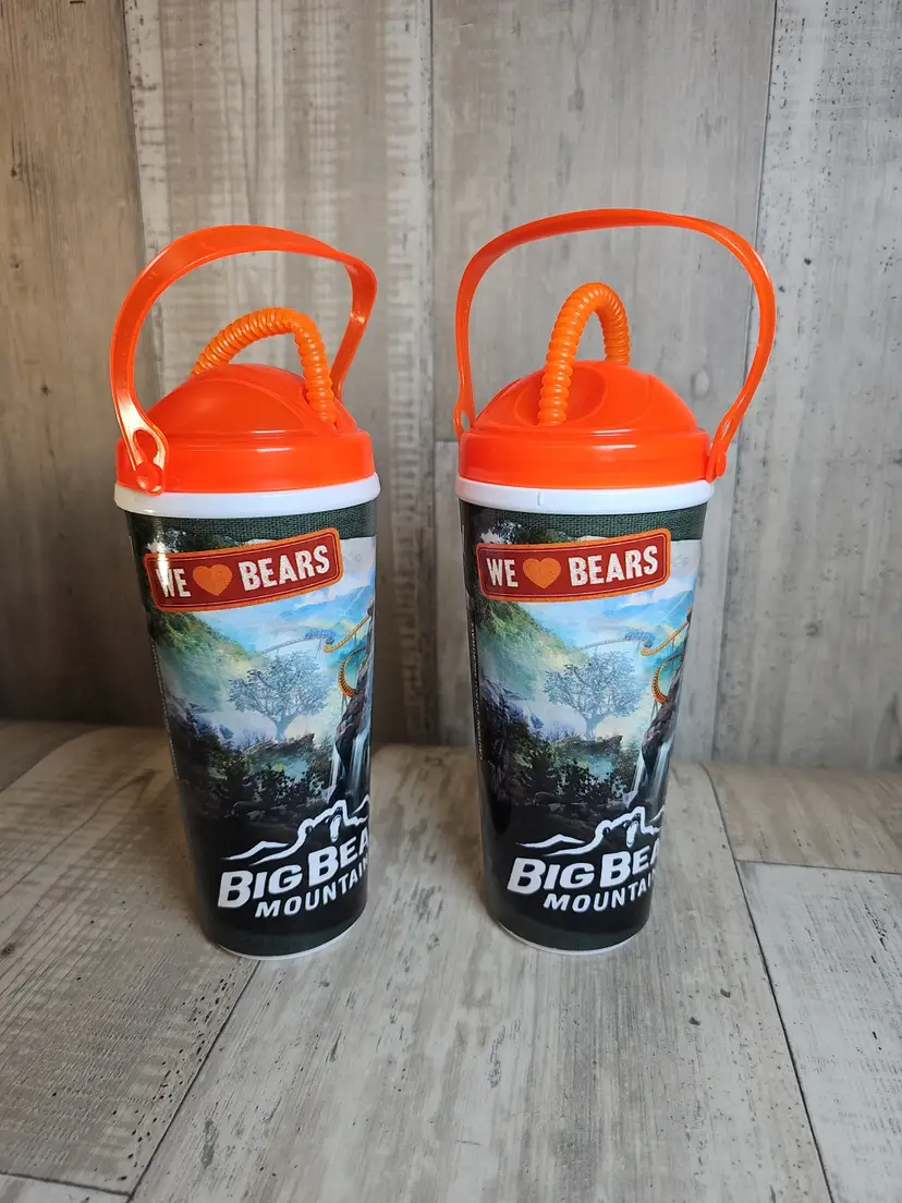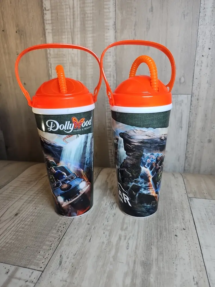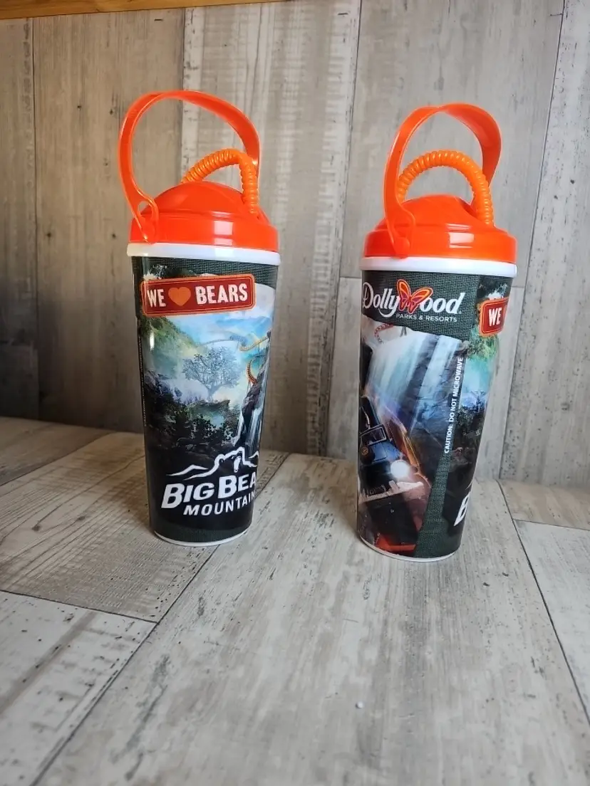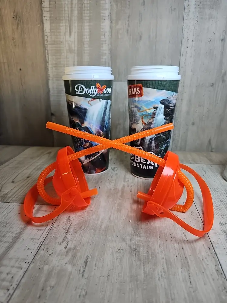 Description: Pair of 24oz Dollywood Big Bear Mountain souvenir tumbler cups with orange lids and matching straws. Both are clean and in excellent display condition — perfect for Dollywood fans or collectors of theme park memorabilia.