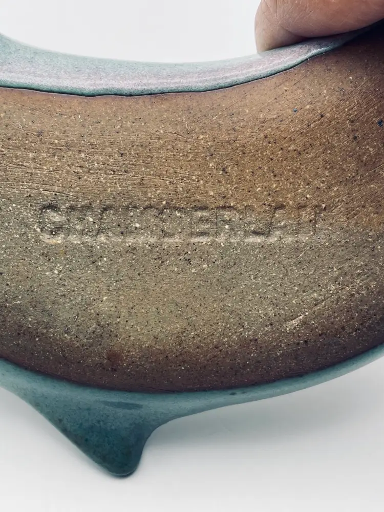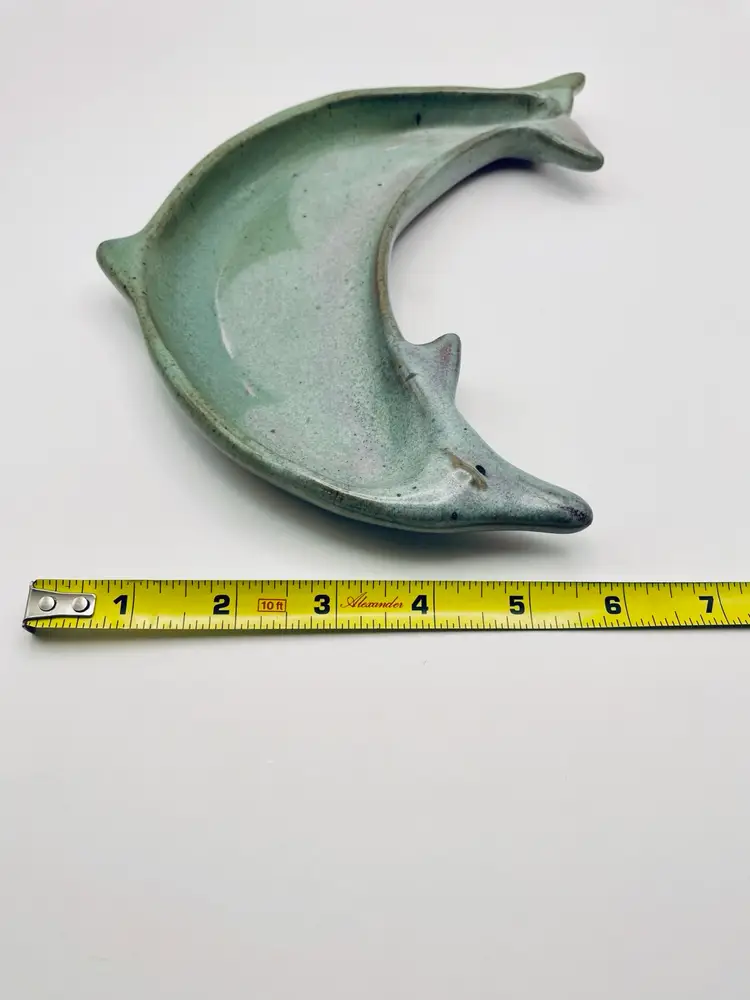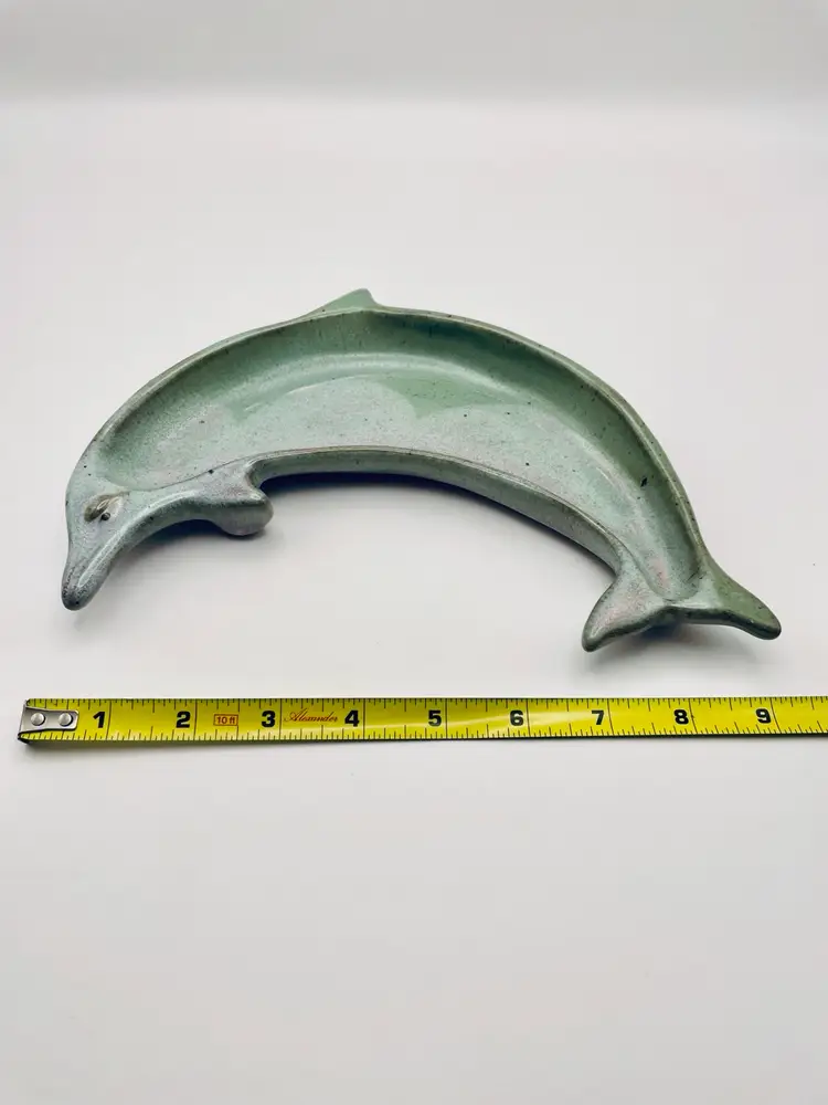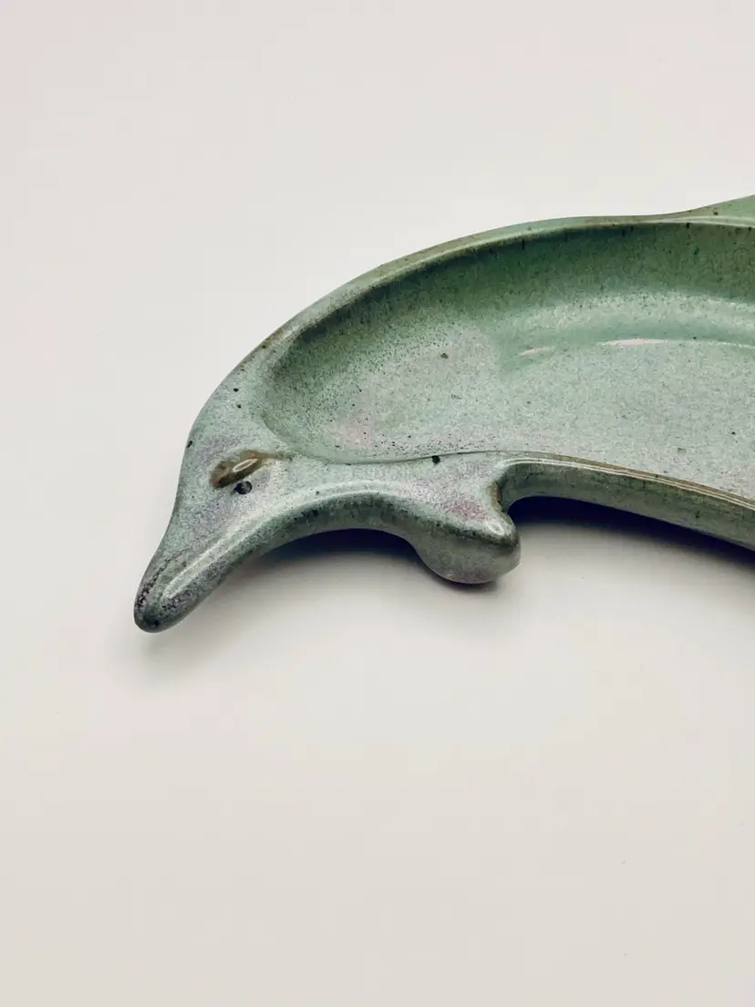 From Chamberlain Pottery, located in Brooksville, FL. handmade pottery dolphin in a soft green with lilac accents! Stamped Approx. 8”L x 7”W x 1”H