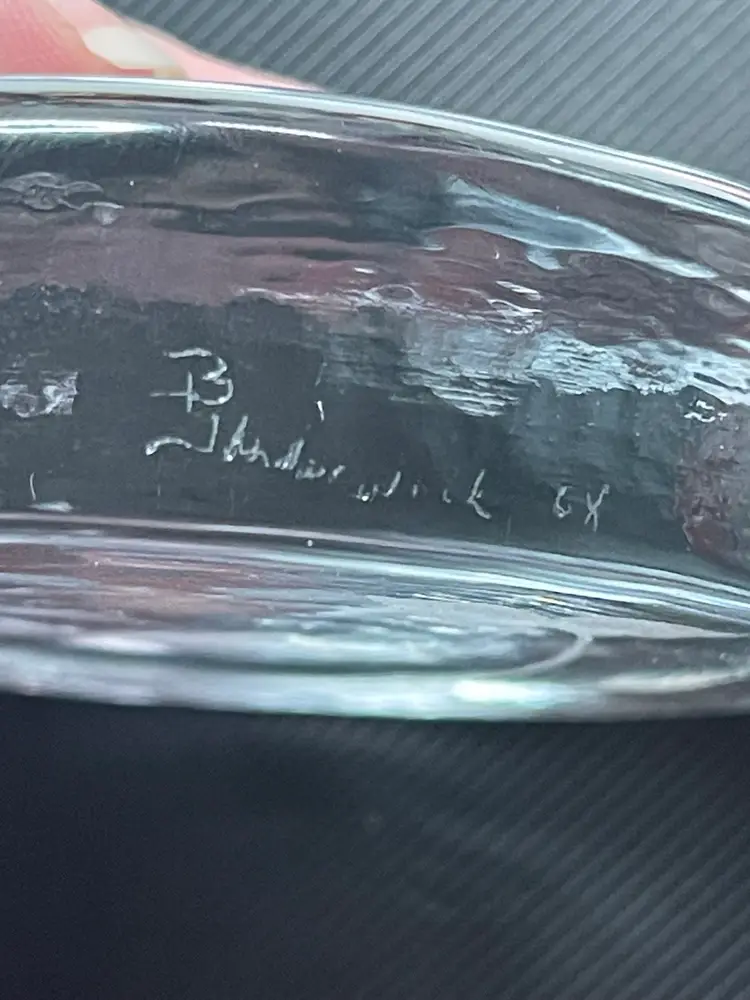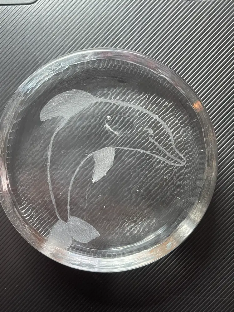 Artist signed, vintage, pressed glass, etched dolphin paperweight. I am unable to make out the artist signature, but it looks like it could say B. Johnston with the year 68 on it. This stands just under an inch tall, and approximately 3 inches across. It does glow under 395 blacklight.