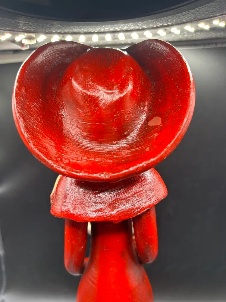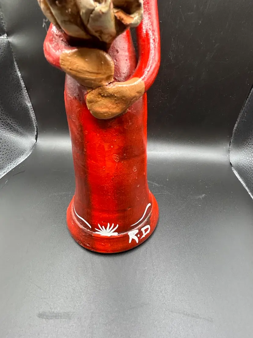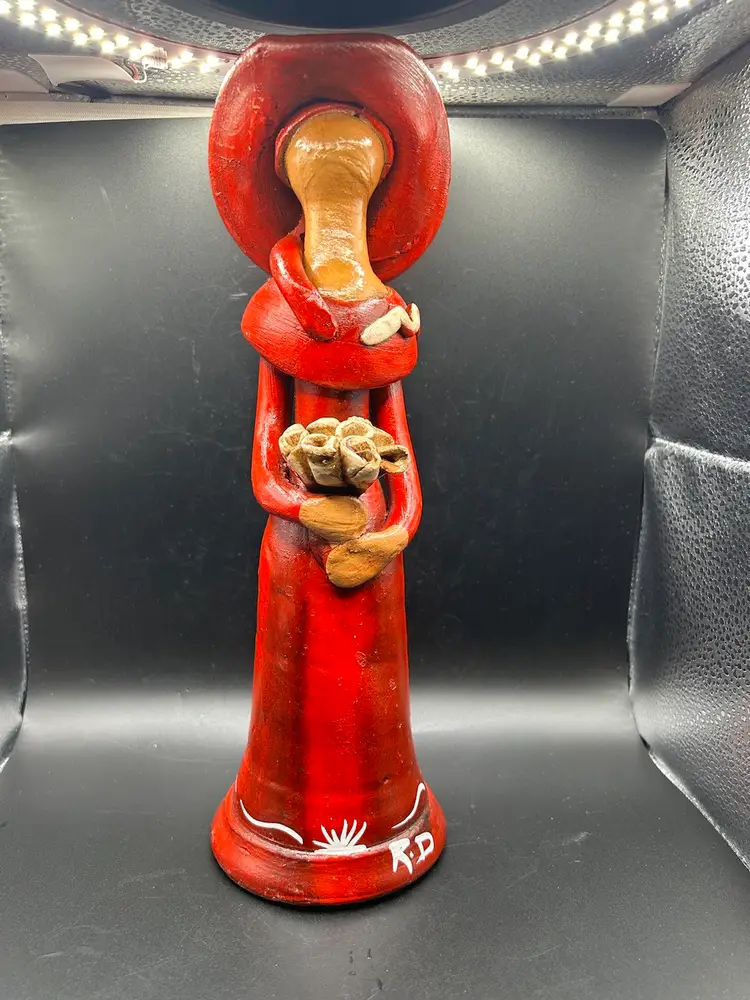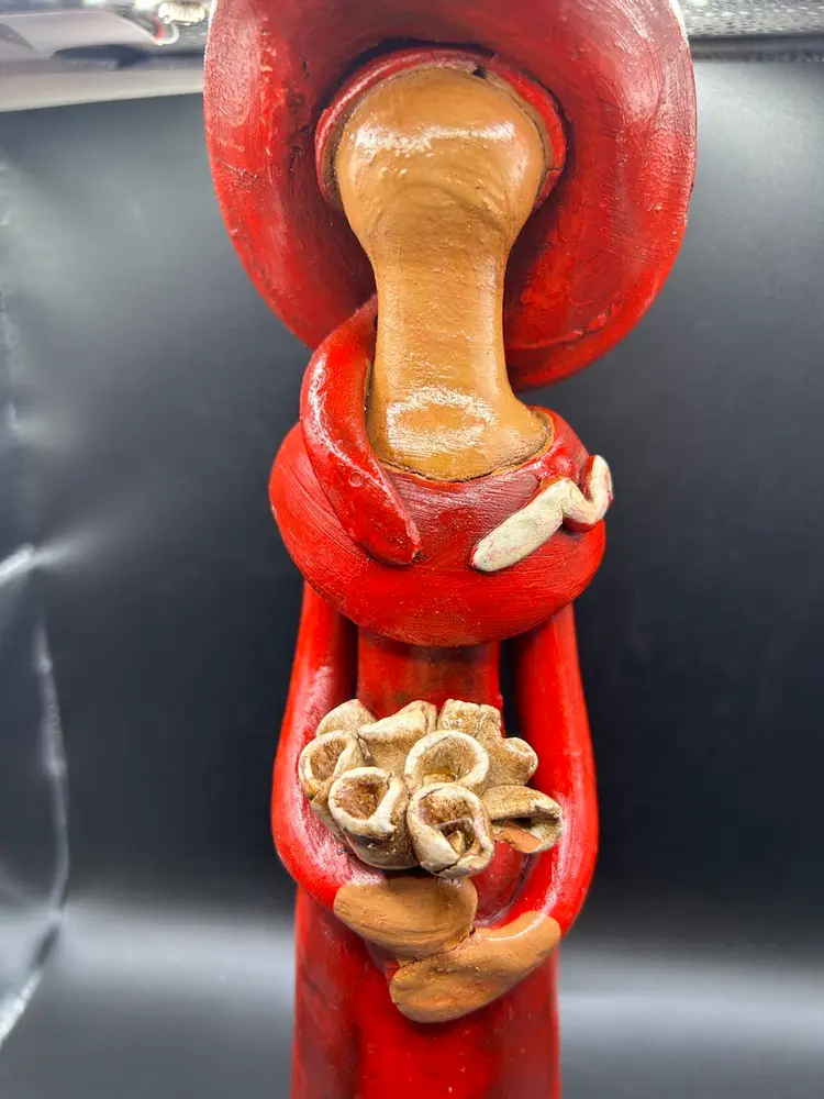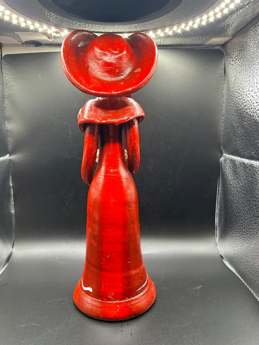 Small line in bouquet, looks done during firing. Small spot of glaze off hat in back. See pic. All other condition perfect. No chips. 11H x 3.5W.