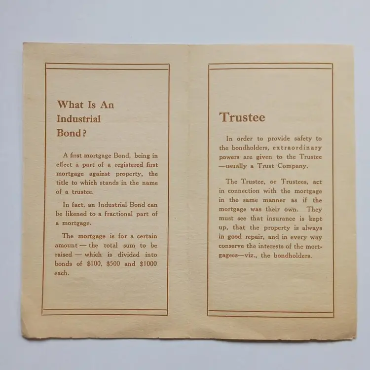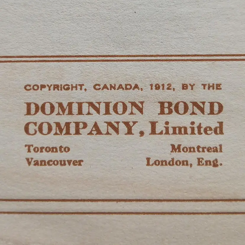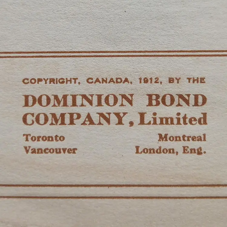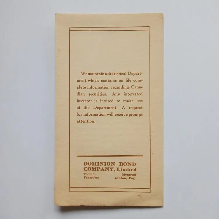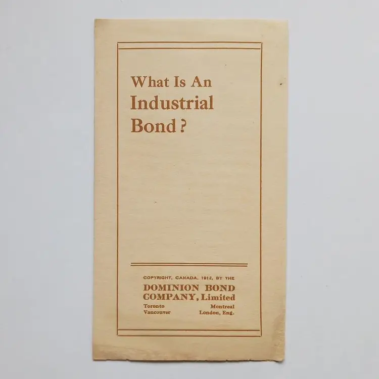 This Dominion Bond Canada Industrial Bond Advertising Information Booklet is a rare piece of Canadian financial history. Produced in 1912 by Dominion Bond Co., Ltd., the booklet measures 3.5 x 6.25 inches and features a buff colored cover with brown lettering. Inside, you'll find detailed information about Industrial Bonds. This booklet is a must-have for collectors of vintage financial documents or anyone interested in Canada's financial history. It was manufactured in Canada and is representative of the country's financial industry in the early 20th century. Please see photos, item specifics and description. Stained. Moisture Damaged.