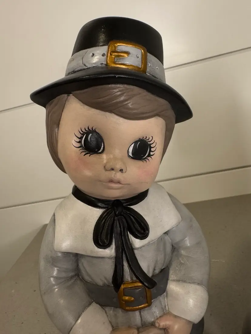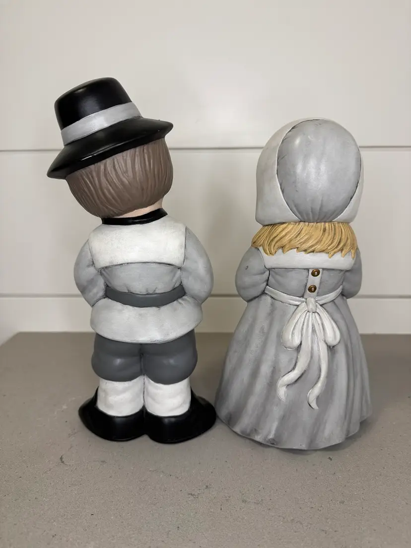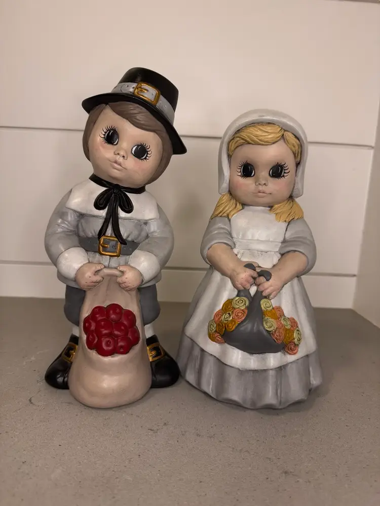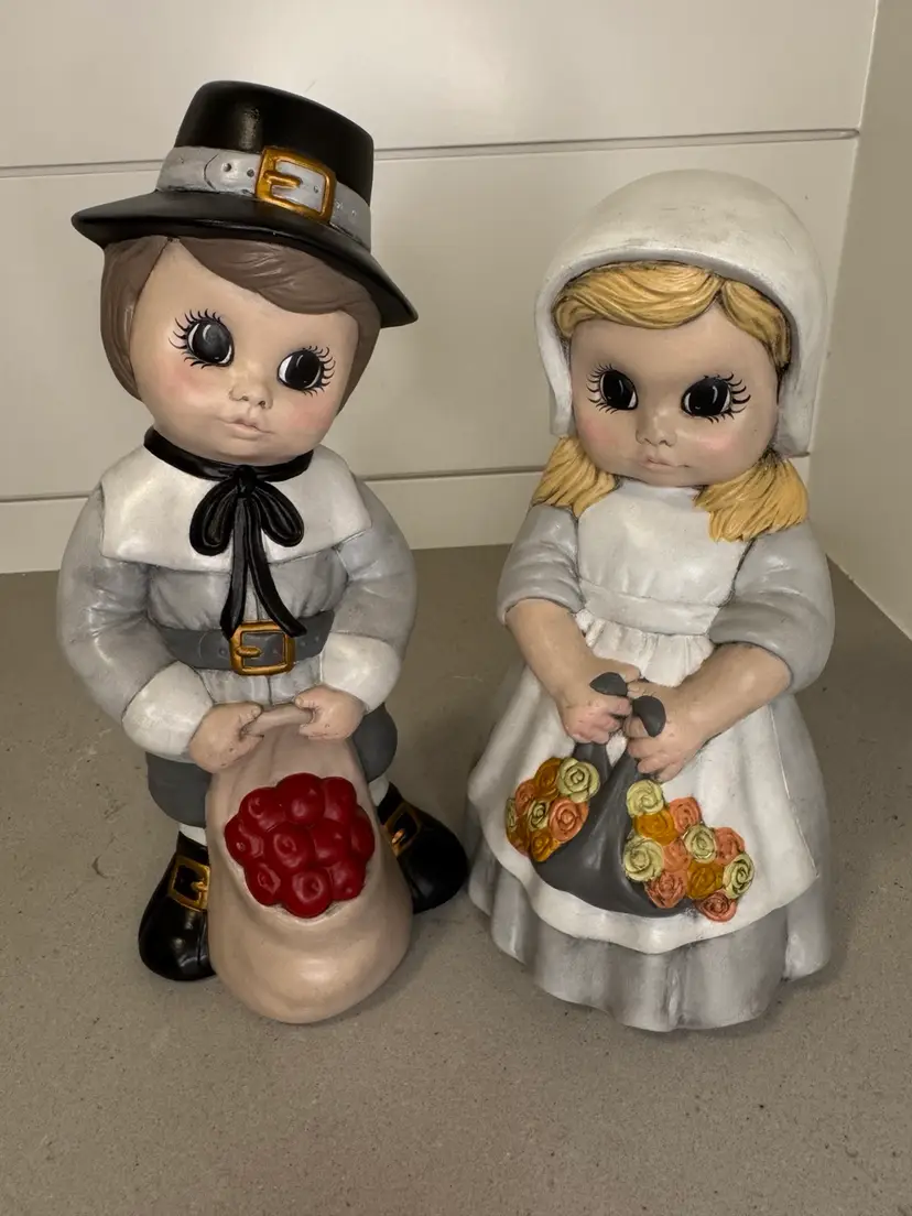 This couple is eerily beautiful Their anthropomorphic style eyes will haunt you forever Handpainted in grays, corals & reds, you can keep this decor out for Halloween & Thanksgiving Boy measures approximately 10“ tall & 4.5” at the base Girl measures approximately 9” tall & 5” at the base Both display quality workmanship and are in excellent vintage condition with no chips, cracks or repairs Priced & sold as a set