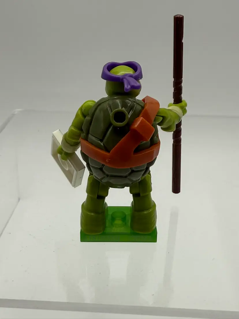 Donatello Teenage Mutant Ninja Turtles Minifigure Includes minifigure, bow staff, picture & stand block From Mega Bloks Teenage Mutant Ninja Turtles Series 1 blind packs Figure stands about 2 inches tall Removed from pack to assemble and list