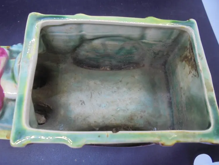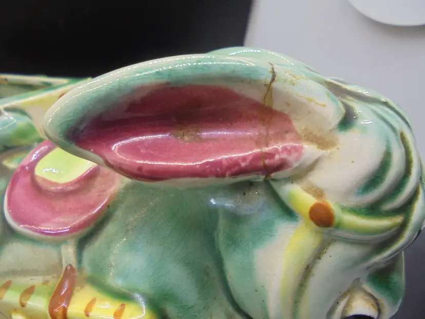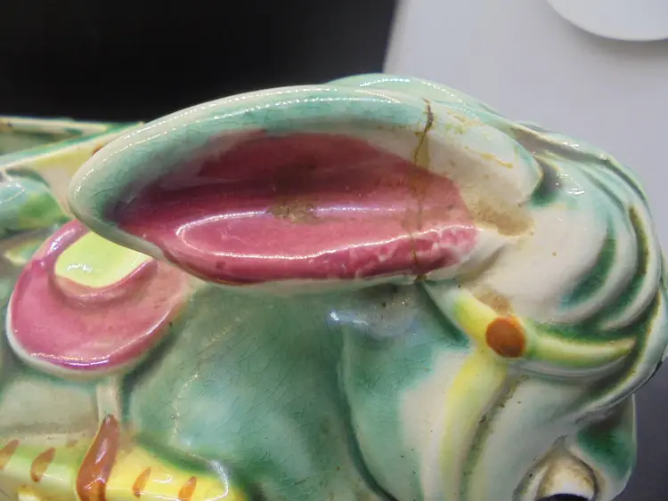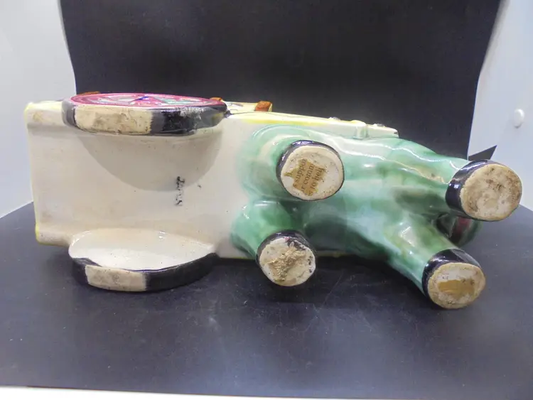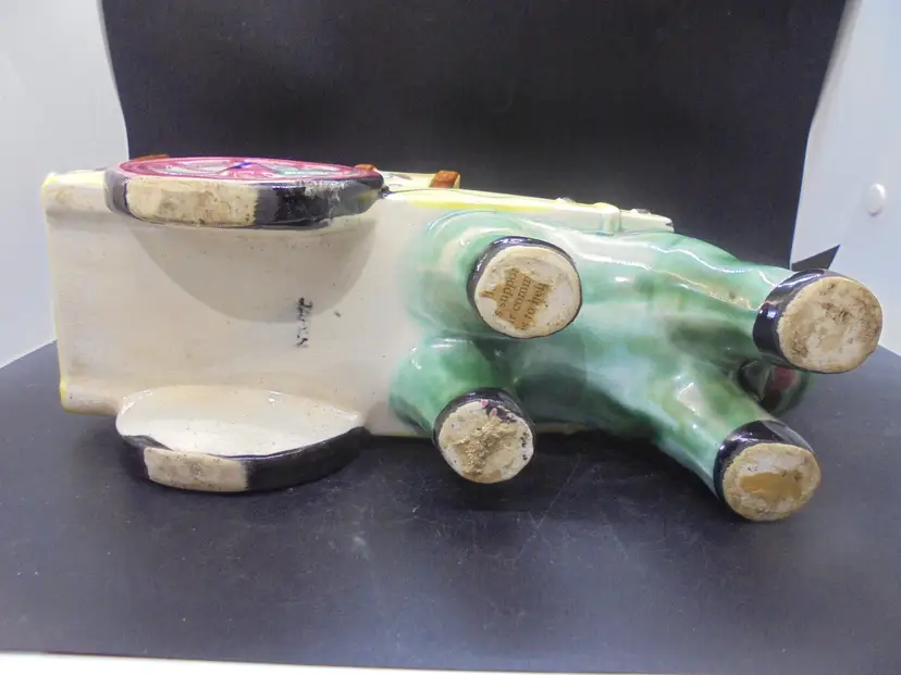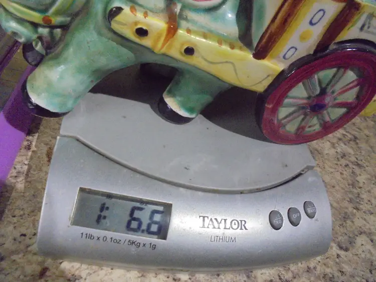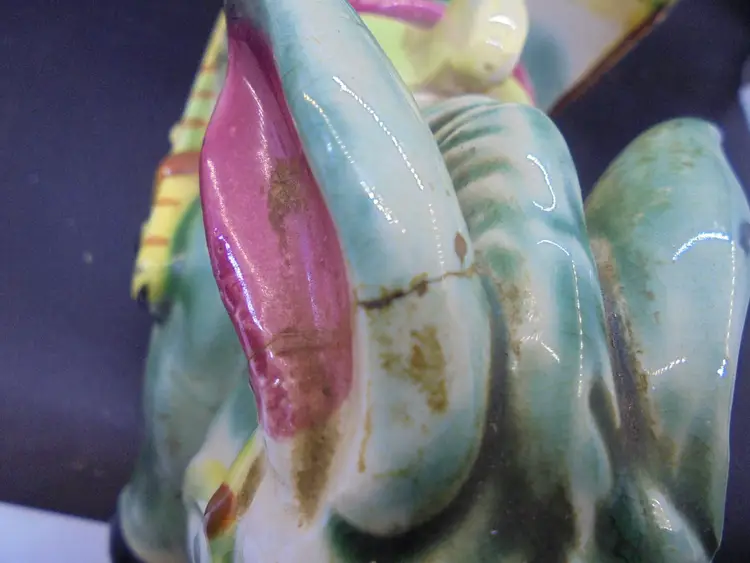 Measures 9 1/2" from head to back of cart-- the donkey's right ear has been glued on (pictured) and the cart has a chip and small crack (pictured)--