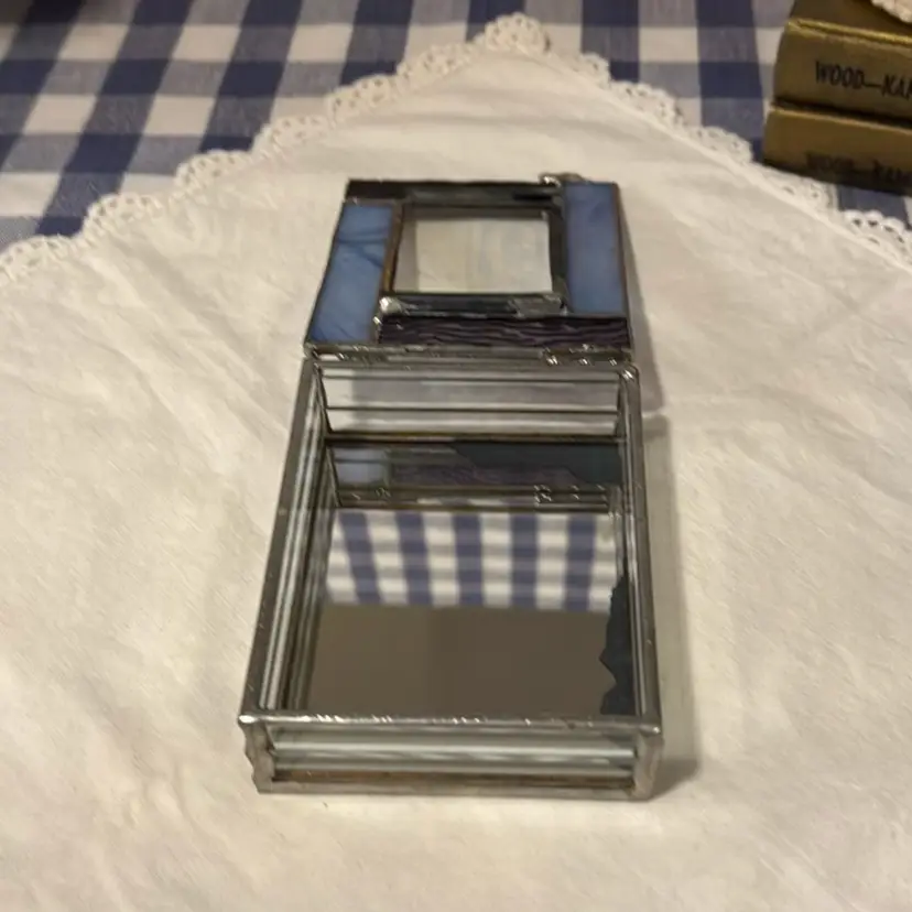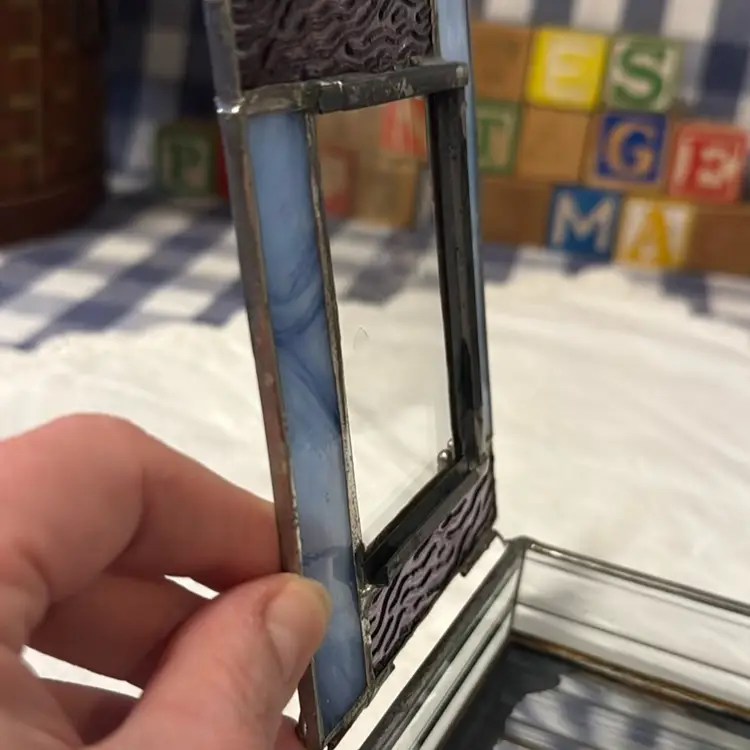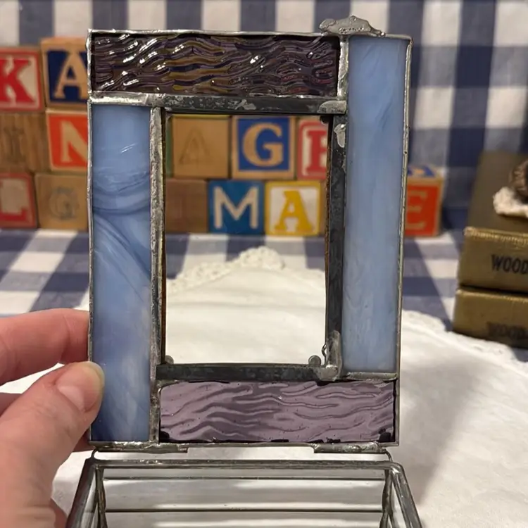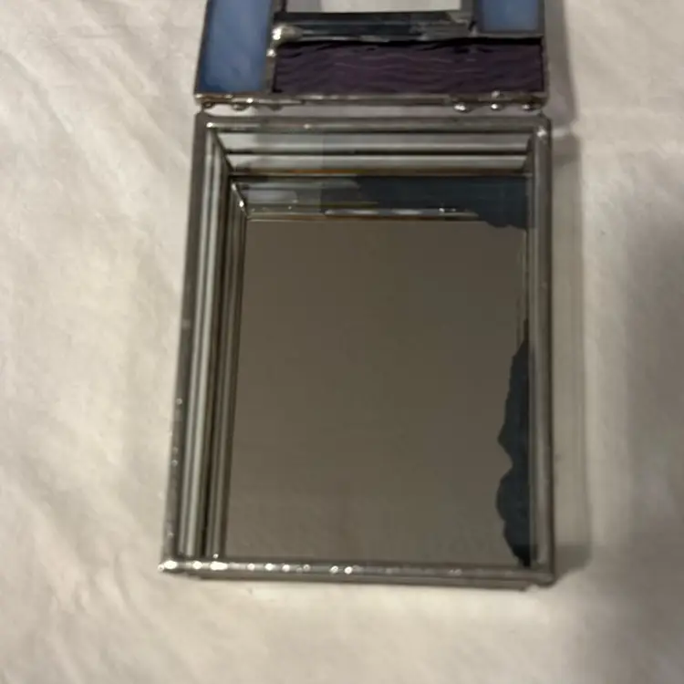 Amethyst, iridescent purple, and clear stained glass. Mirrored inside. Some damage on the mirror inside the box. The lid has an option to enter a photo, if desired.