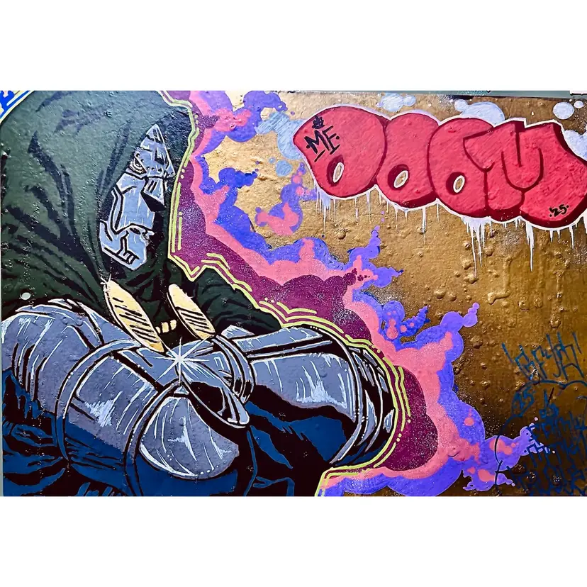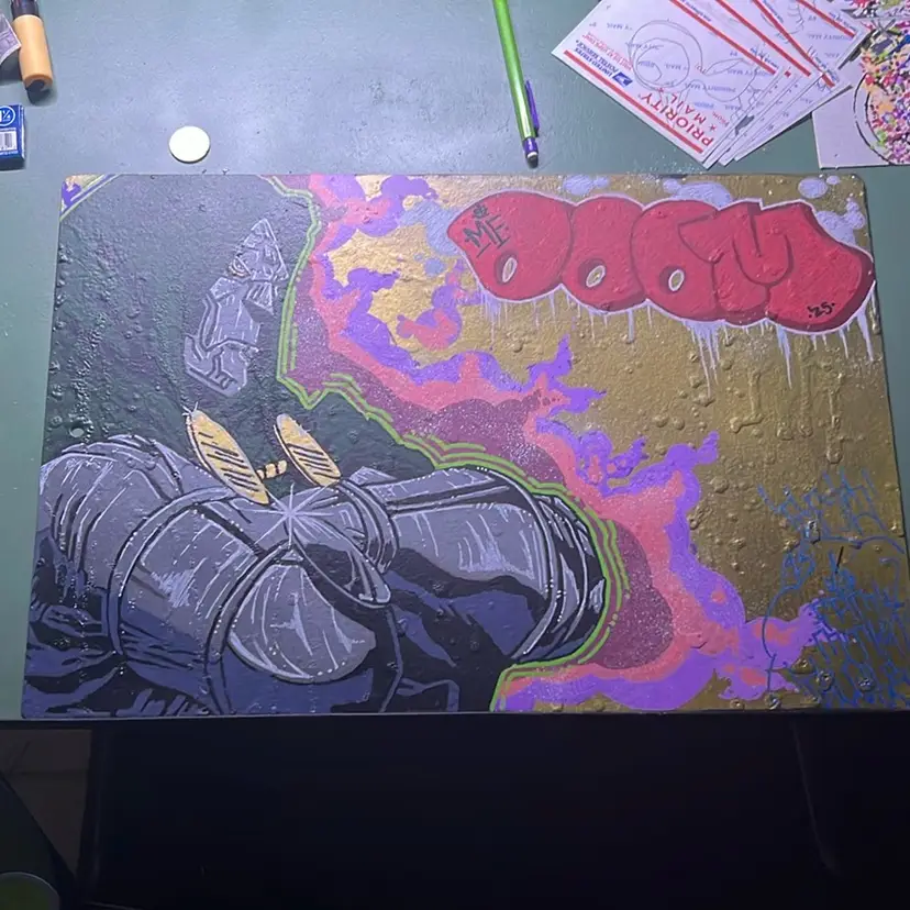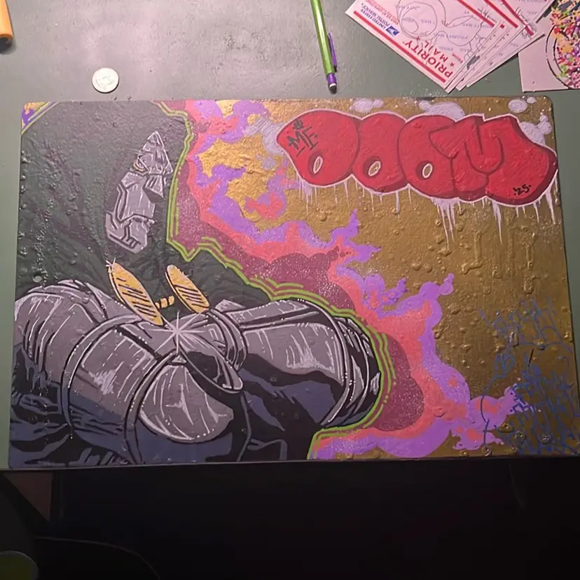 19x13in custom dr doom desk mat painted with spray paint and acrylic and clear coat ready to remind you to abide by no man’s laws but your own!