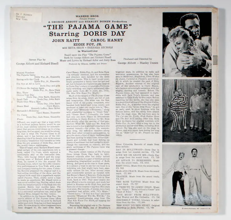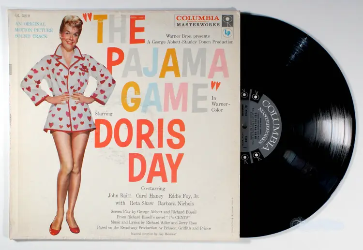 The Pajama Game, by Doris Day, was faithful to the movie of the same name. Not only did Warner Bros. retain the Richard Adler-Jerry Ross score in its entirety, but the film company also preserved most of the cast, including male lead John Raitt and supporting actors Carol Haney, Eddie Foy Jr., Reta Shaw, and Buzz Miller. The only significant substitution was that of Hollywood star Doris Day for Broadway female lead Janis Paige, probably a box-office necessity. But Day fit right in, and the script was not altered to emphasize her part. Instead, the production remained an ensemble story in which Raitt got to sing the hit Hey There and Haney had showcases with Steam Heat and Hernando's Hideaway. Day shone on I'm Not at All in Love, throwing herself into the production number, and paired well with Raitt on Once-a-Year Day and There Once Was a Man. Foy and Shaw retained their own showcase number, I'll Never Be Jealous Again. The show worked as well on film as it had on stage, and the score remained fresh and catchy. The soundtrack album was nearly as popular as the original Broadway cast album had been three years earlier, making the Top Ten.
