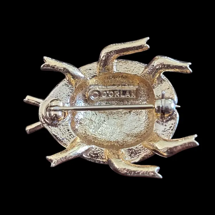 Gold tone with red enamel and rhinestone accents. In good condition 1.25”