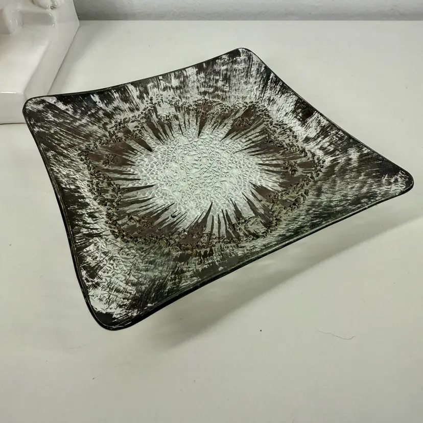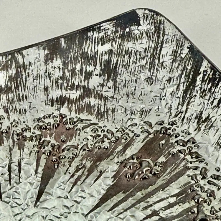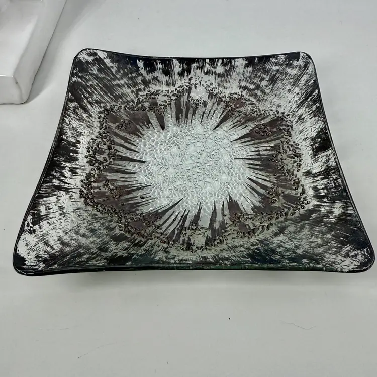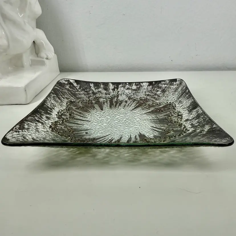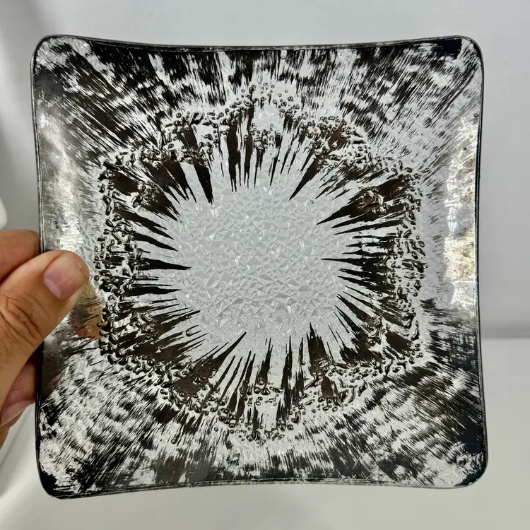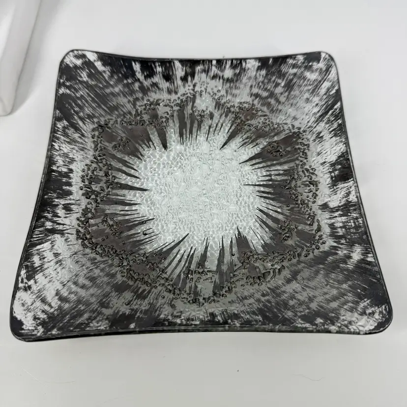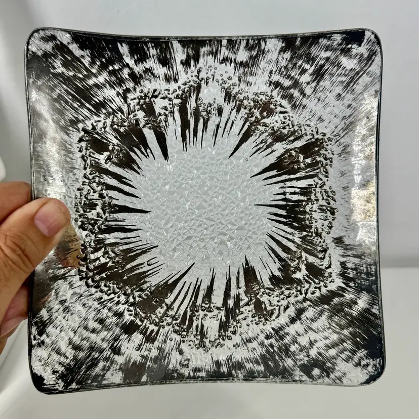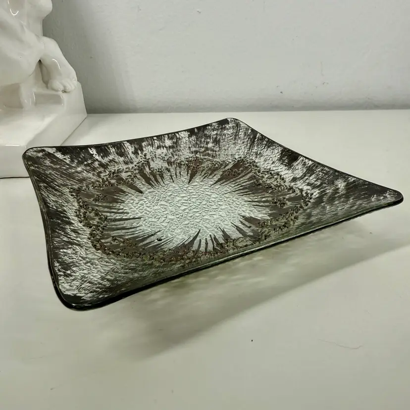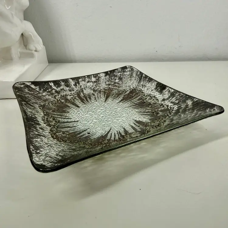 Hi... Elevate your serving experience with the DOROTHY THORPE Atomic Splash Serving Dish, a true gem from the 1950s. Masterfully crafted from glass, this small, square dish boasts a distinctive textured silver finish that reflects the era's embrace of atomic design elements. The unique Atomic Splash pattern adds a touch of glamor to any table setting, making it perfect for both casual occasions and all-out celebrations. The serving dish is also a decorative piece that seamlessly blends with MCM (mid-century modern) and Eames-era decor. Carefully hand wash only to maintain its timeless elegance.