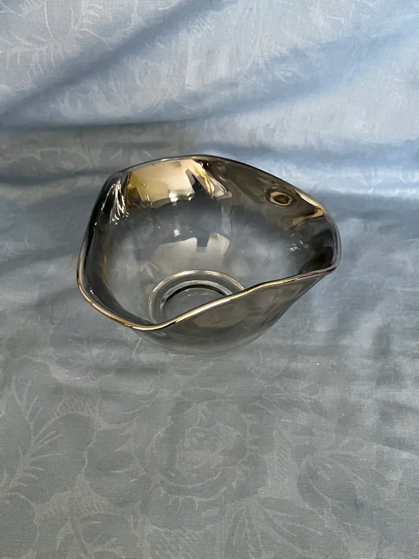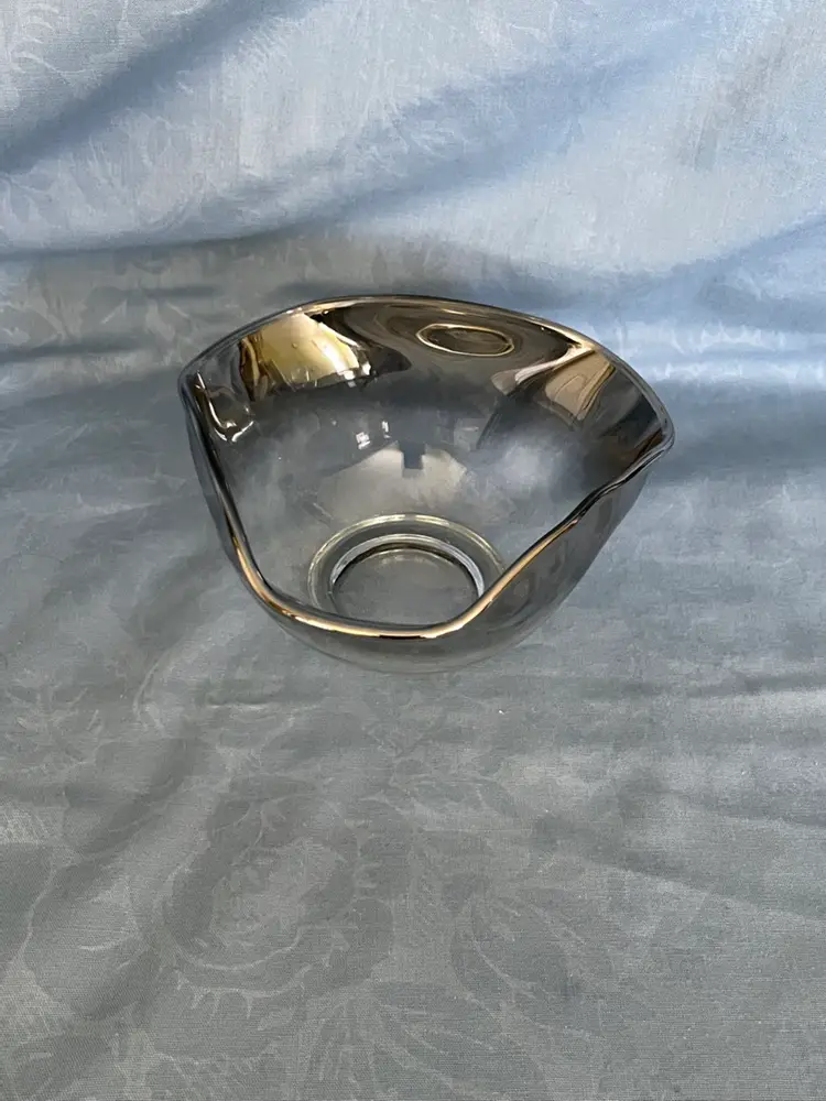 This vintage silver fade bowl is a must-have for any mid-century modern collector. With its unique design it is very eye catching. The bowl is perfect for serving nut candy or any other small treats, and its size is just right for displaying on a shelf or table. This bowl is a true vintage piece that will add character to any space. It's not handmade and has been well-loved, which is evident in its beautiful silver fade. It is perfect for a side table as it measures 5" across at the widest point and 2 3/4" high. it's in wonderful Vintage condition.