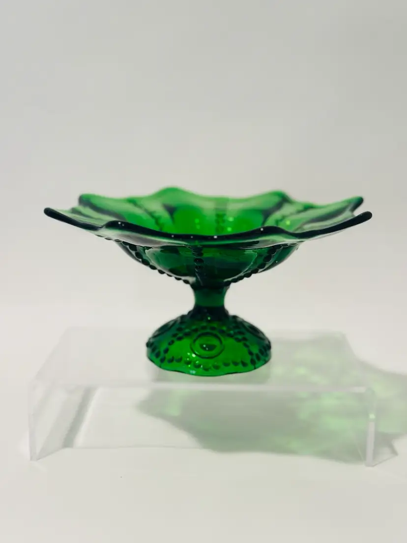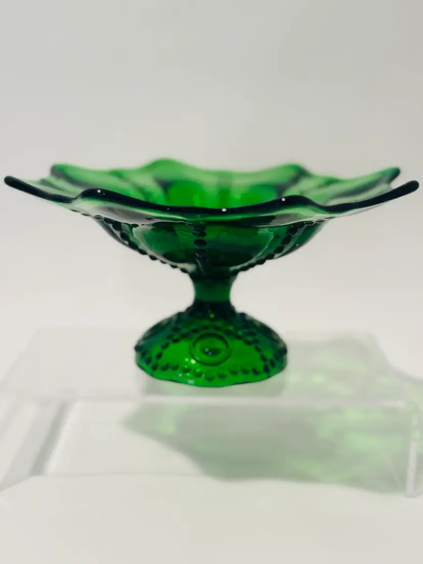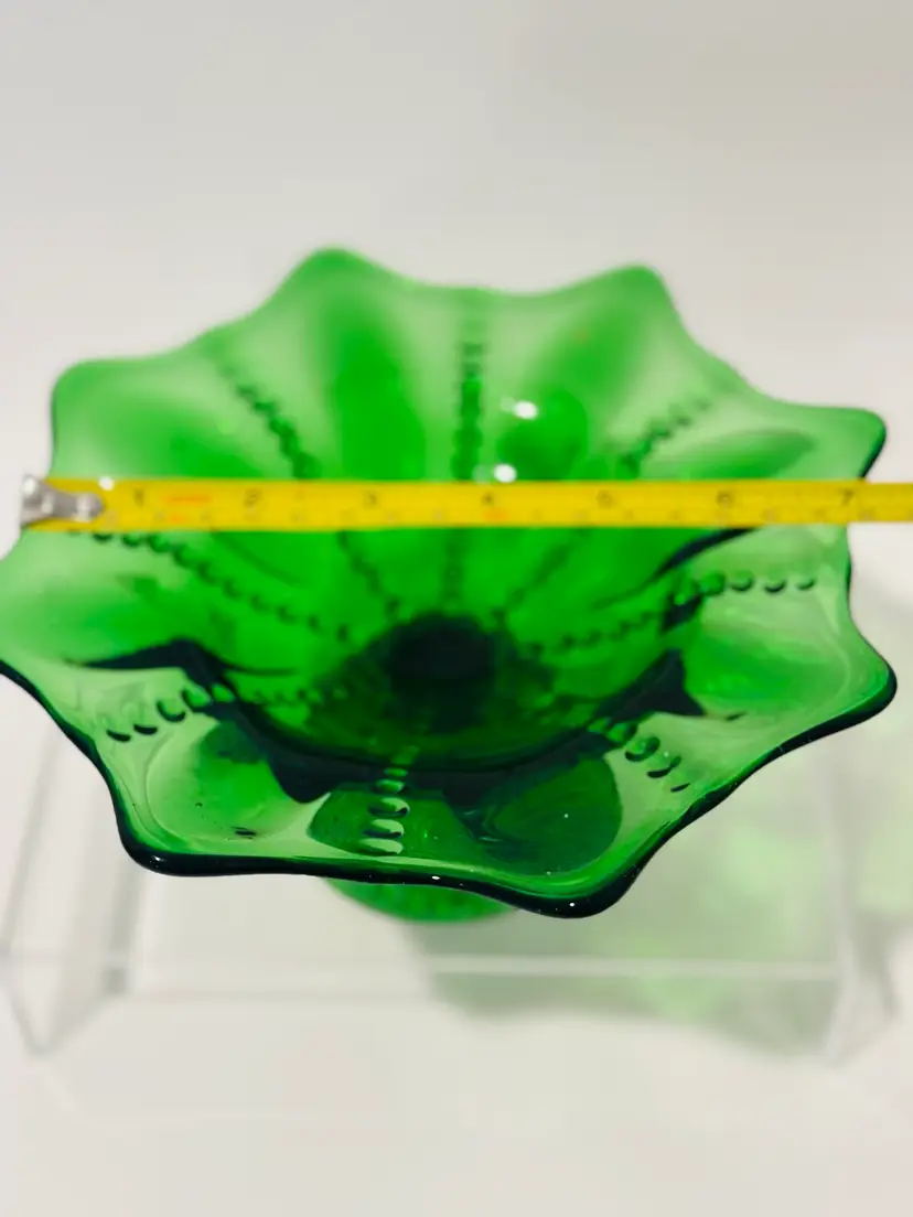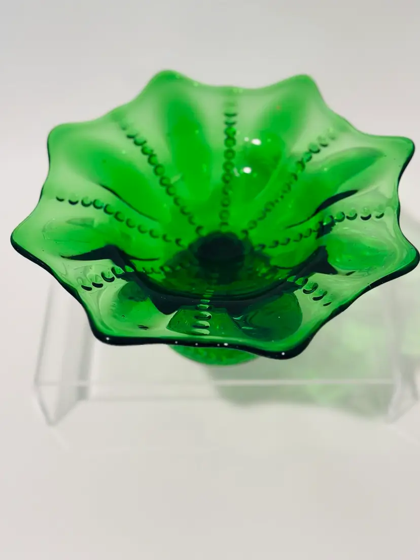Add a touch of vintage elegance to your collection with this stunning green glass compote bowl. The pedestal design features a dotted foot and ruffled spike edge, adding a unique touch to this mid-century piece. The abstract pebblestone pattern and decorative features make it a perfect addition to any occasion.