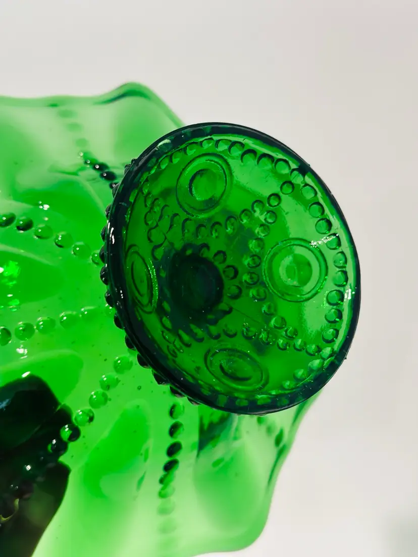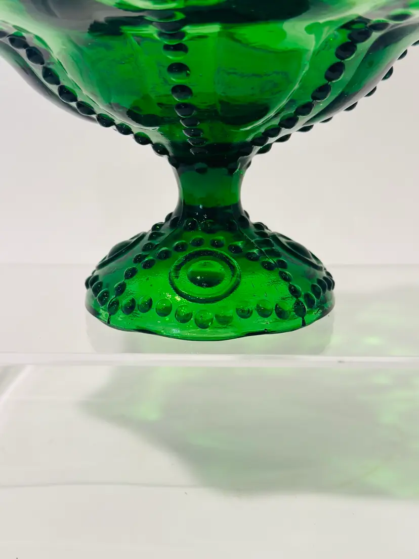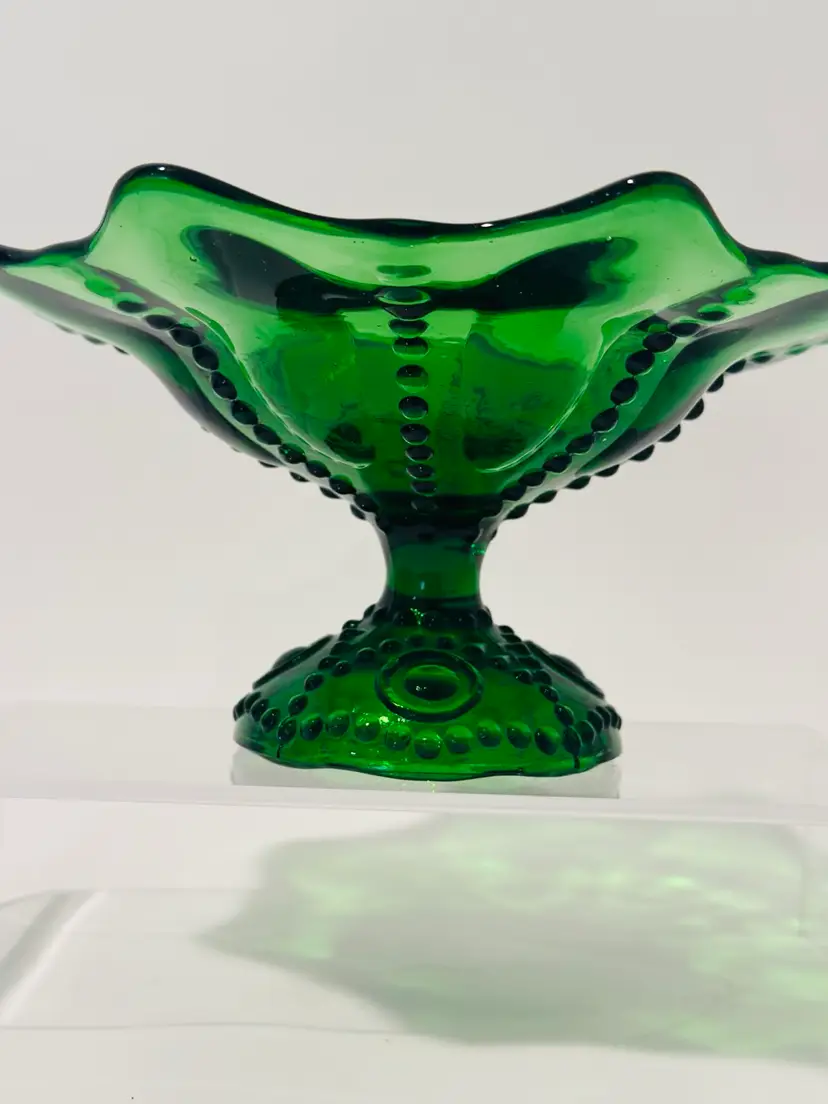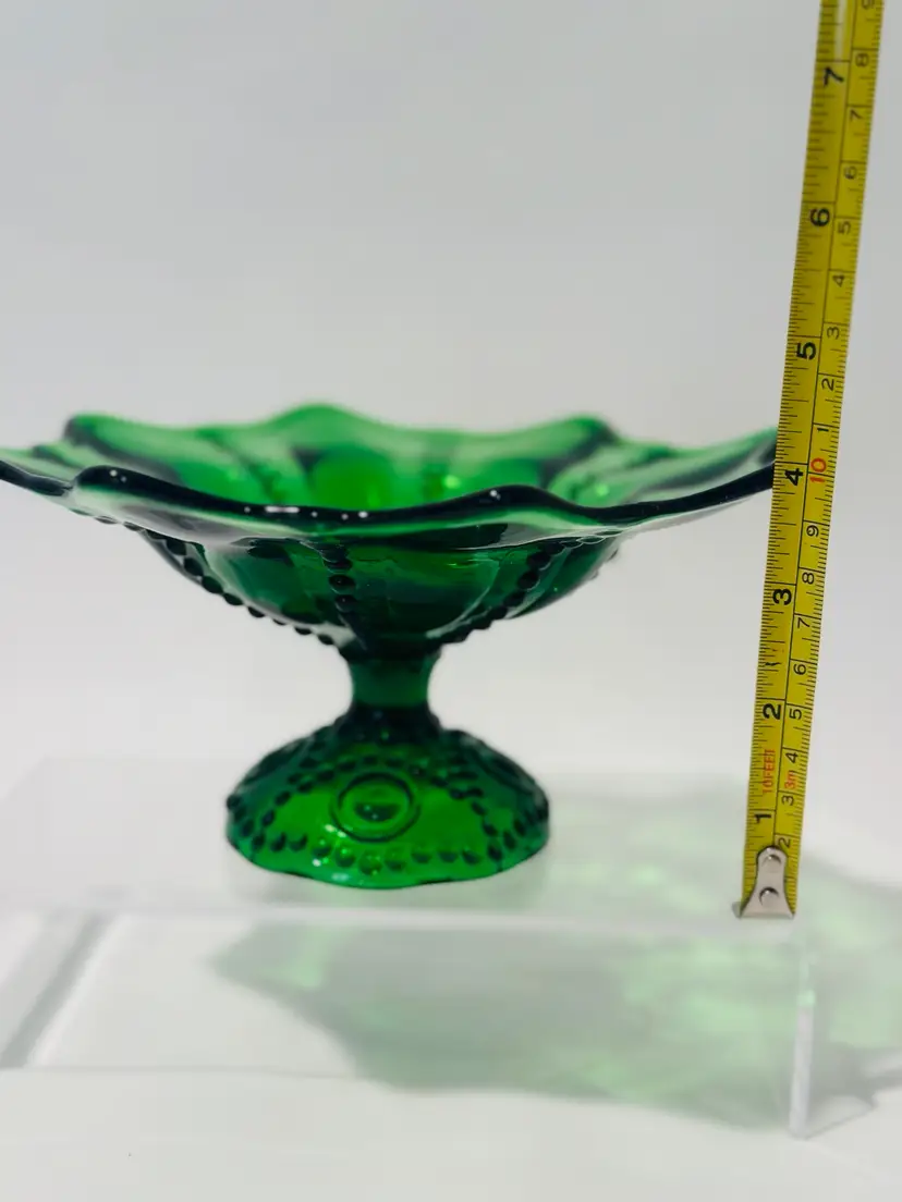 Add a touch of vintage elegance to your collection with this stunning green glass compote bowl. The pedestal design features a dotted foot and ruffled spike edge, adding a unique touch to this mid-century piece. The abstract pebblestone pattern and decorative features make it a perfect addition to any occasion.