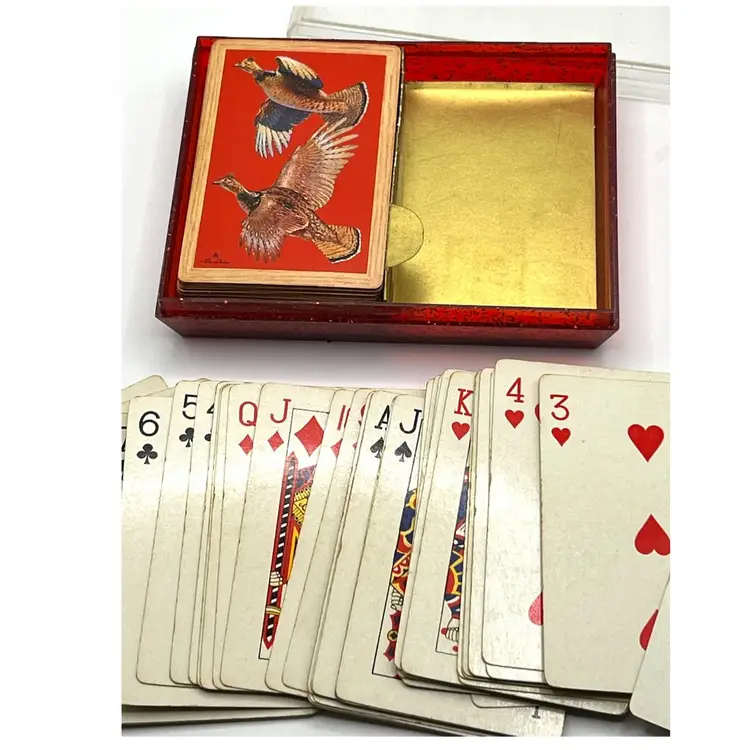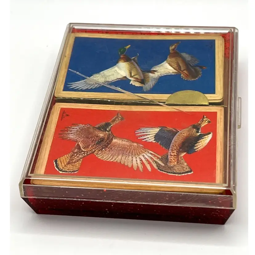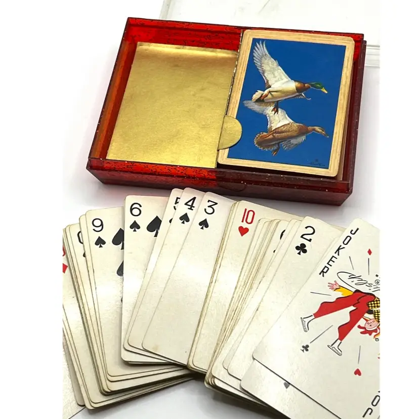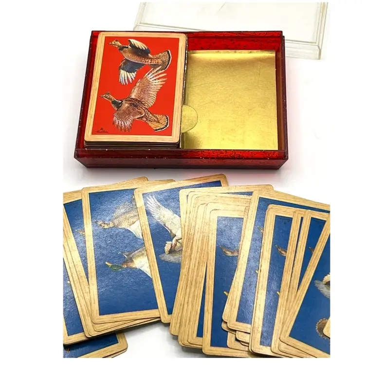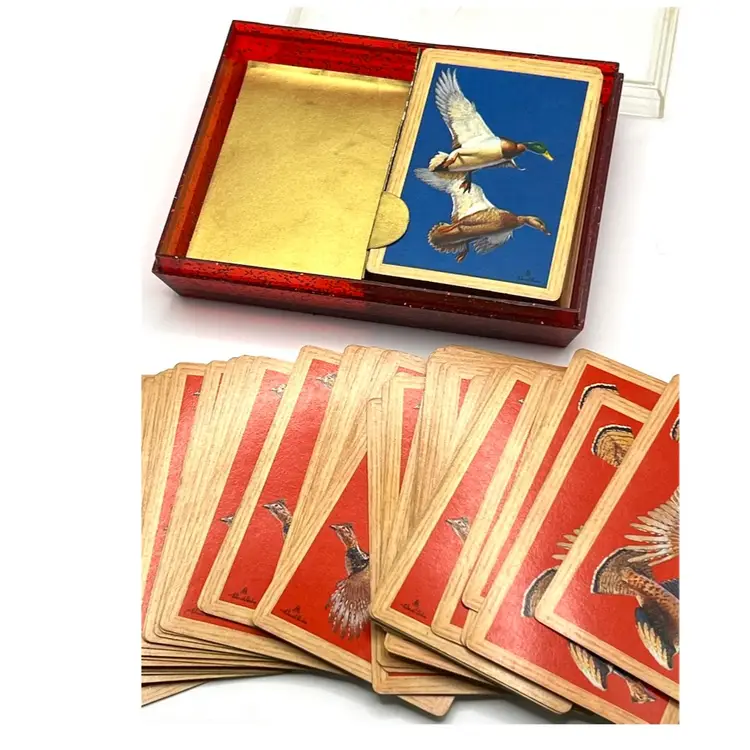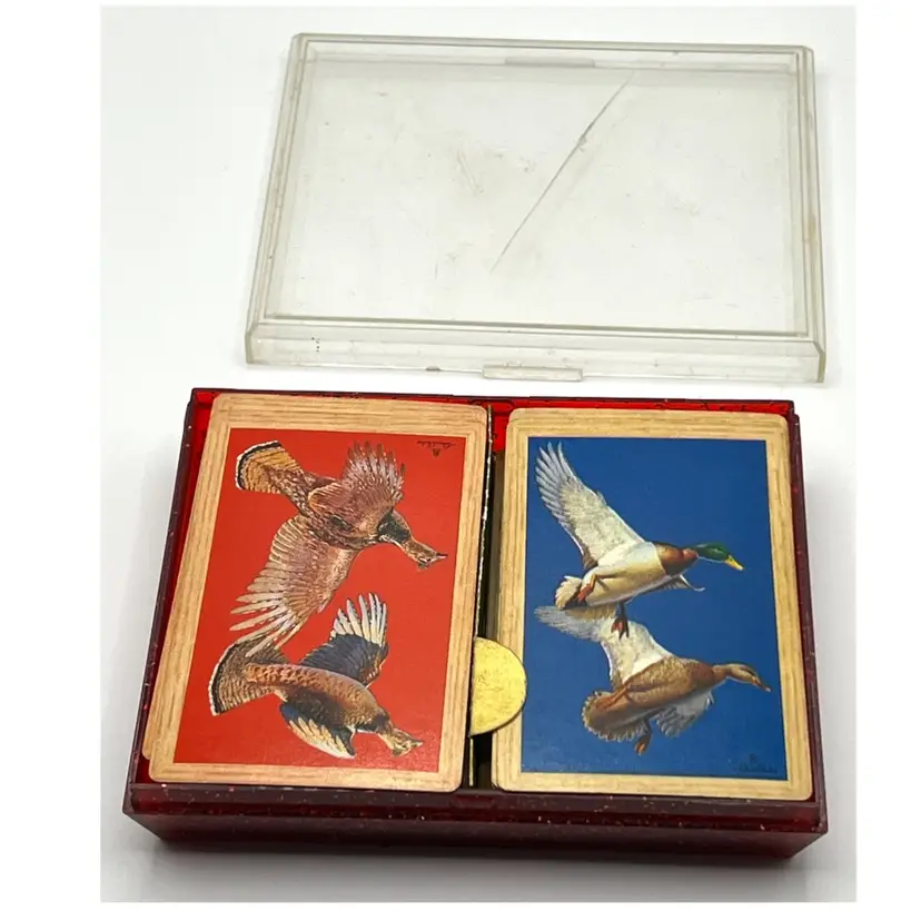 Double Deck Box Red & Blue Playing Cards Richard Bishop Ducks Geese Games. In original box. Cards were used but in good condition. The plastic cover lid of the box has crack (SEE PHOTOS)