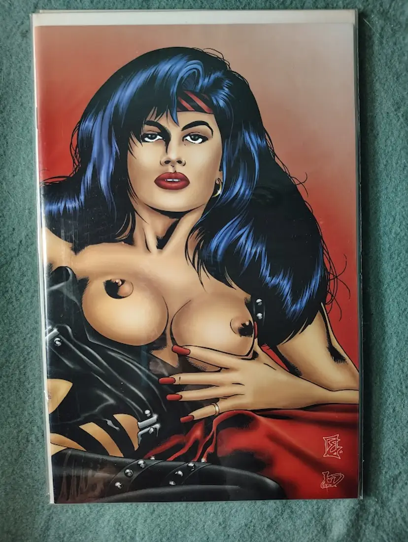 Double Impact #3 from High Impact Studios, action-fantasy series, glossy card-like cover with moderate surface scuffing and faint spine rub; condition Very Fine. Colors remain deep with tight registration and reflective highlights. The heroine aims straight at the reader, chains and gear rendered with heavy airbrush. Typographic emboss look and black field give the imagery a dramatic target-range feel. It is pure 1990s: leather, chrome, and velocity. Readers chased sets like this between mall shops and flea-market longboxes. Each issue promised cinema-style splash pages and kinetic gun-fu vibes. You can almost hear synth stingers and neon hum. For display, it pairs perfectly with acrylic stands and moody lighting. A strong example that carries the pulse of the indie action wave.