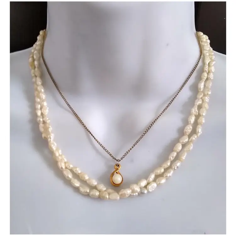 Elegant vintage necklace featuring two strands of lustrous natural freshwater pearls paired with a delicate gold faux pearl pendant necklace.