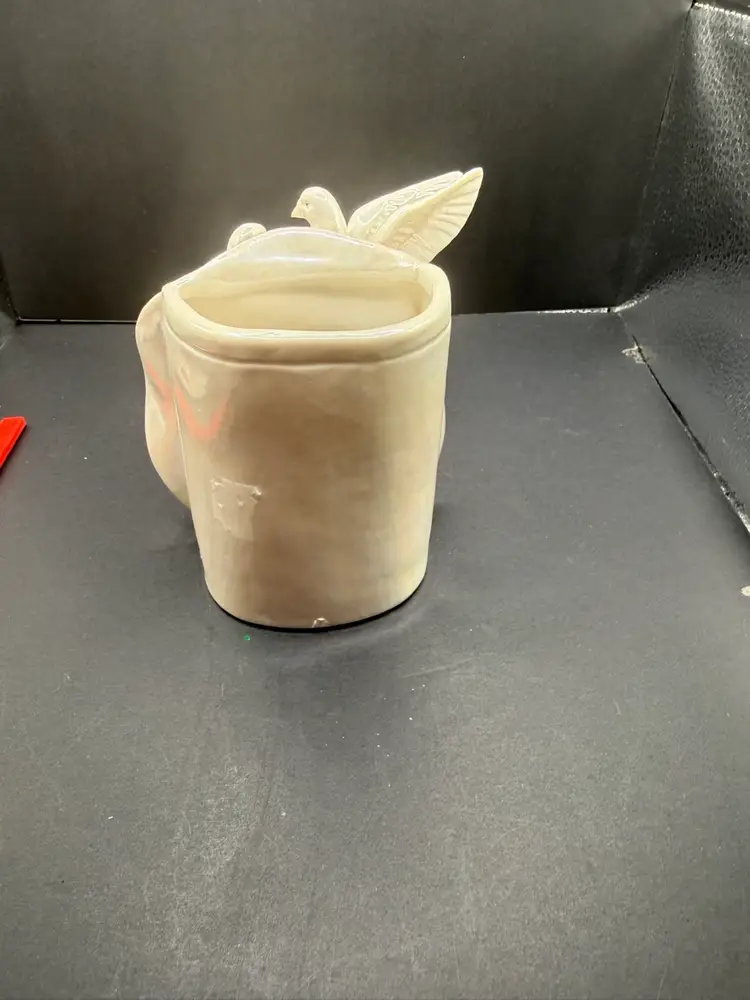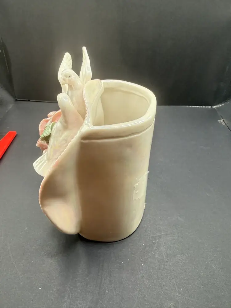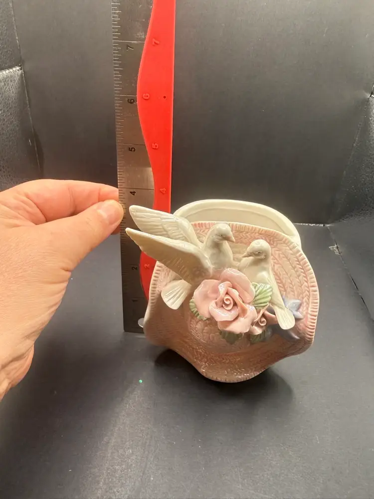 Flowers and doves intact so pretty and it matches the trinket dish No chips or cracks