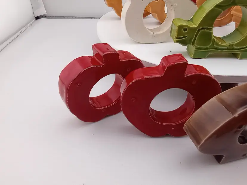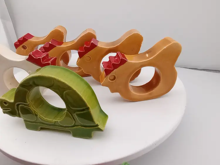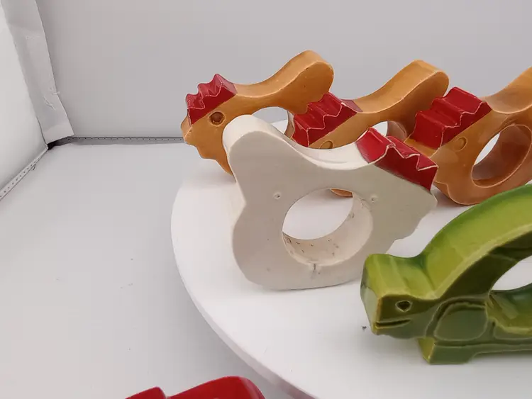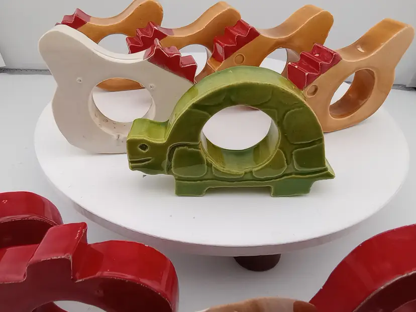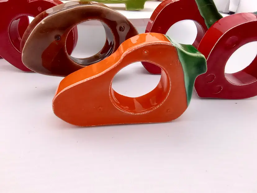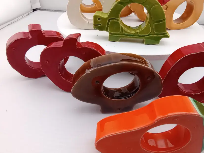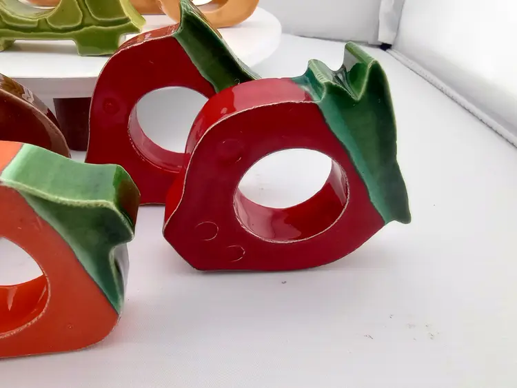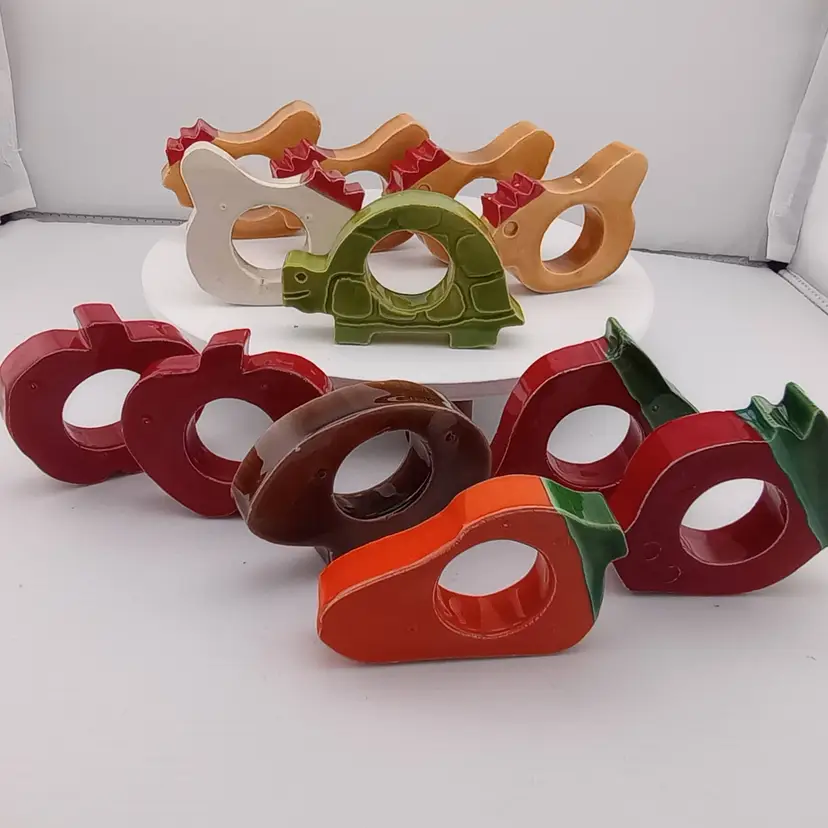 These adorable ceramic napkin rings will make a great accent on your next lunch or dinner table. The dozen include 5 chickens, a turtle, two stawberries, two apples, a mushroom, and a carrot. They are around 2.5" across and in very good vintage condition with a few flea bites.