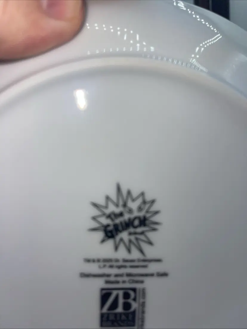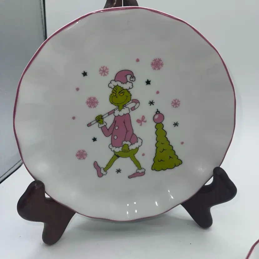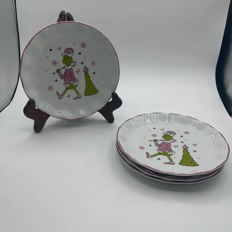 These are brand new. They are the Grinch with a Christmas tree. The Grinch is wearing pink with pink snowflakes. You’re receiving a set of four these 8 inch plates.