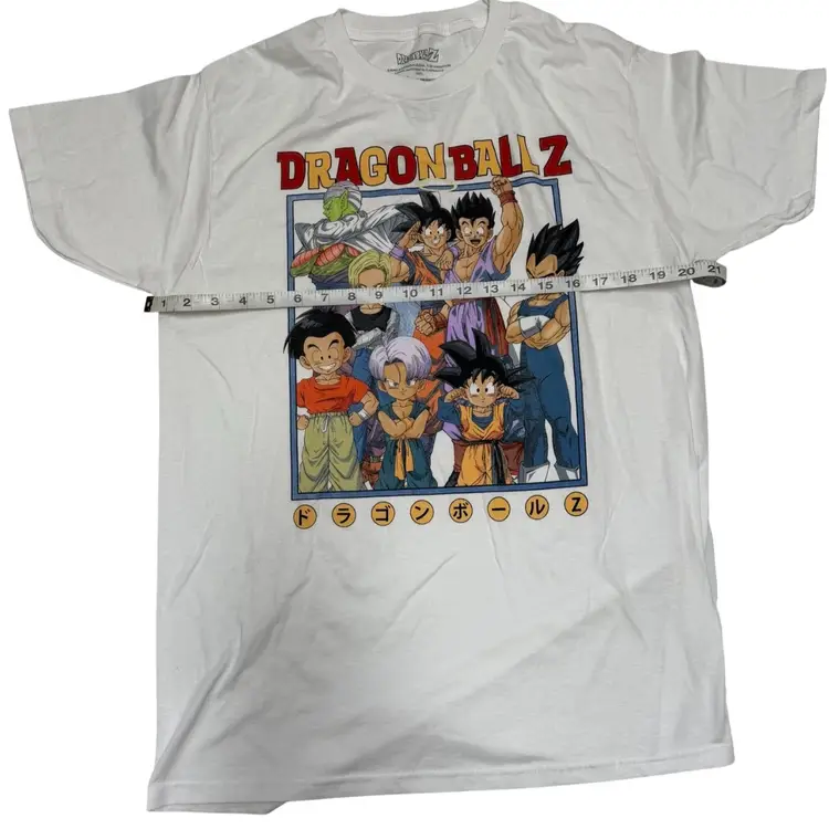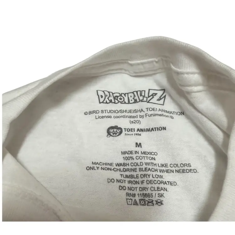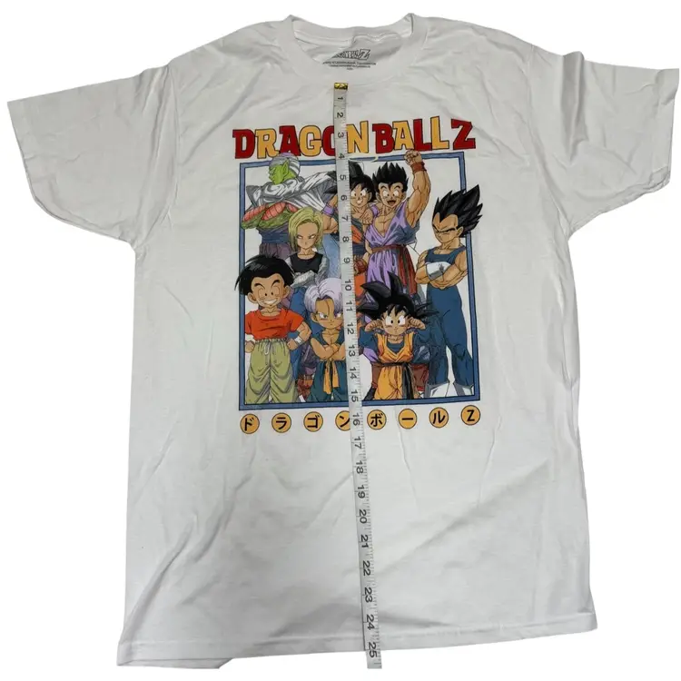 NWOT This Dragon Ball Z Kanji Characters Graphic Print White Men’s T-Shirt in size M is a stylish and comfortable addition to any anime fan's wardrobe. Made of cotton with a regular fit, this short sleeve shirt features a crew neck and a logo accent. The graphic print showcases iconic Dragon Ball Z characters in a classic 90s style, making it perfect for all seasons and suitable for both men and women. Whether you're a fan of the anime or just appreciate a great graphic print, this t-shirt is sure to stand out and show off your love for the beloved series.