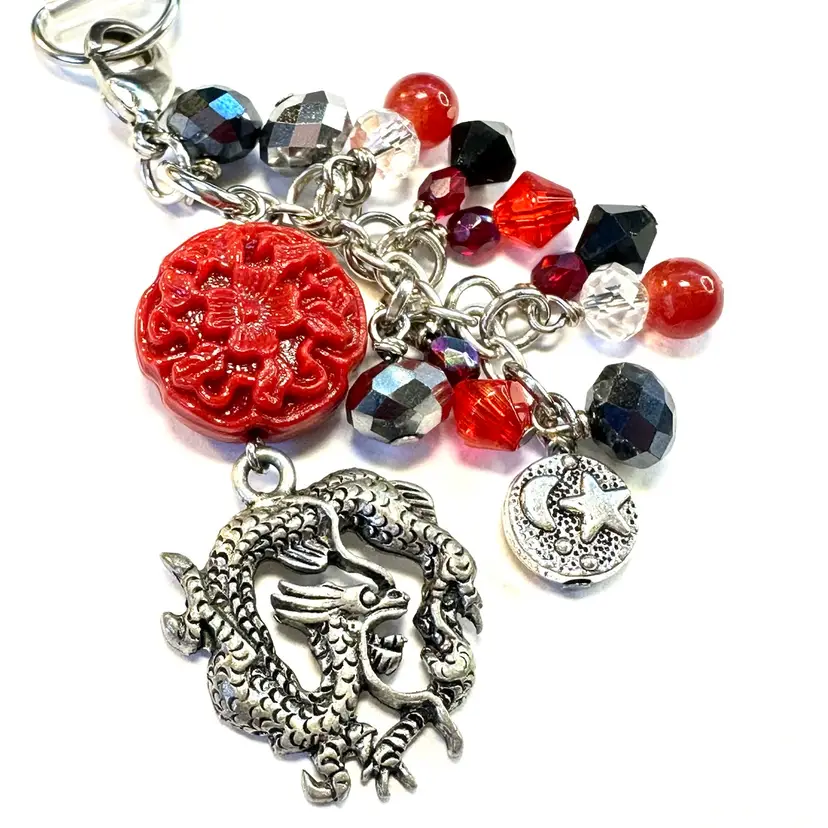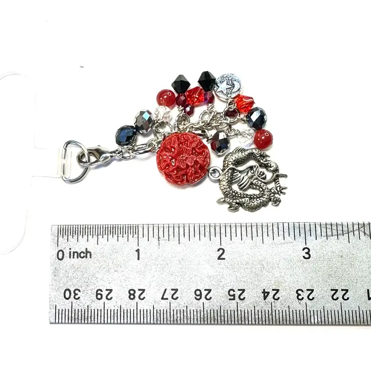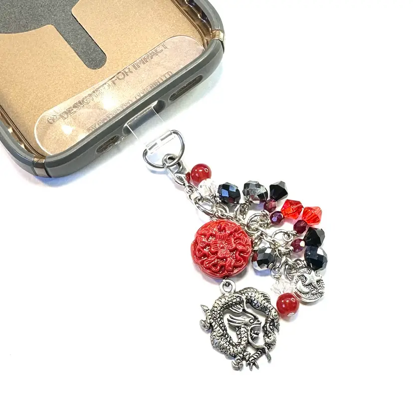 Features dragon charm, faux cinnabar bead, and glass beaded dangles Silver tone findings Cell phone charm holder fits between the phone and the case Lobster clasp allows for quick and easy removal when needed without removing case Made by me with repurposed jewelry pieces