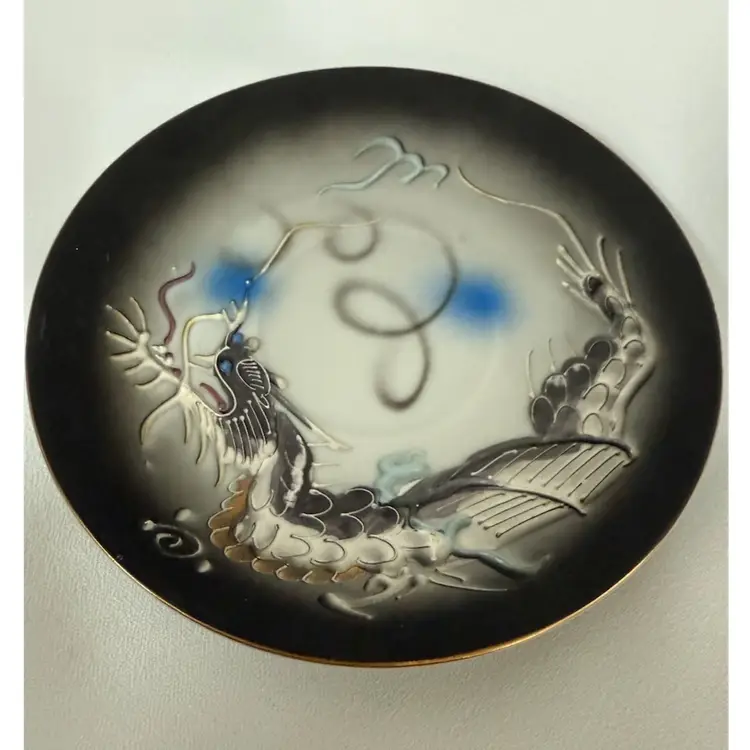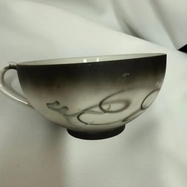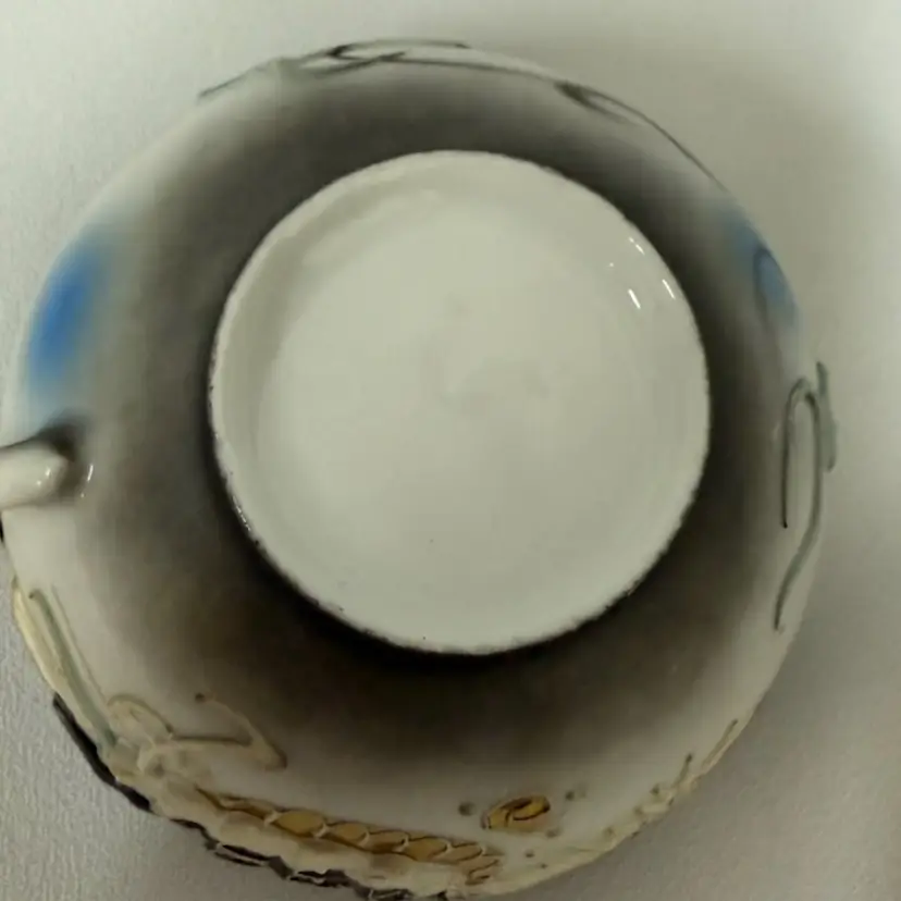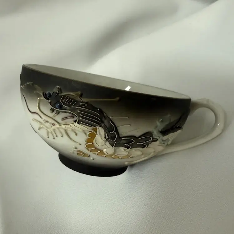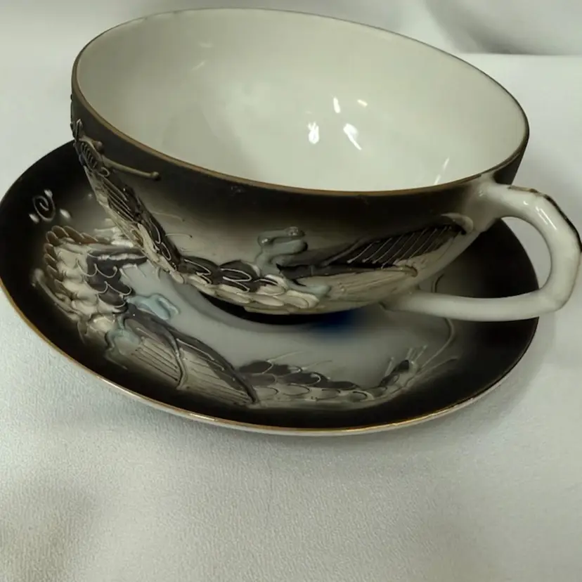 Japanese dragon ware tea cup and saucer. Moriage and a lithopane geisha in bottom of teacup. Great condition. Saucer is 5 1/4 across and tea cup is 2 1/8” tall and 3 5/8” across. I refund shipping overages.