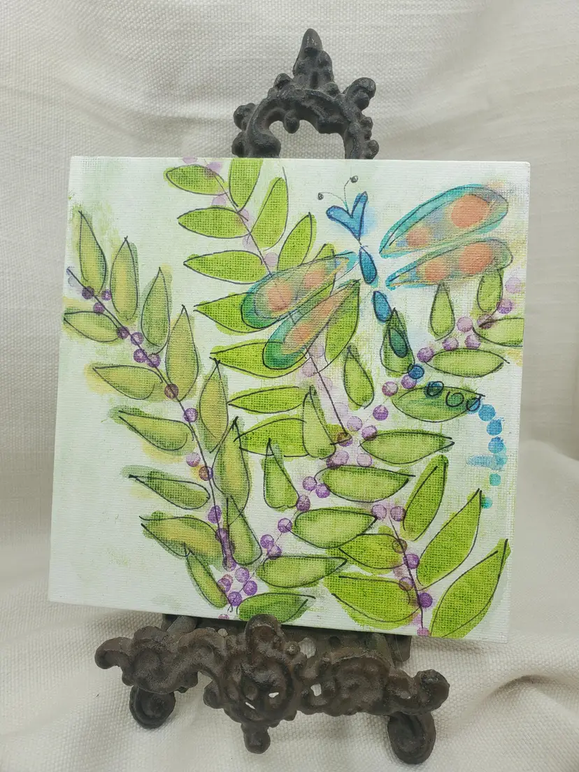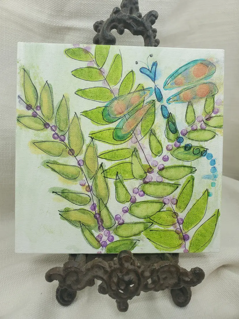 DRAGONFLY AND FERN PURPLE BERRIES Handpainted Whimsical Greenery With Dragon Fly 6" X 6" Canvas Panel Done In India Ink