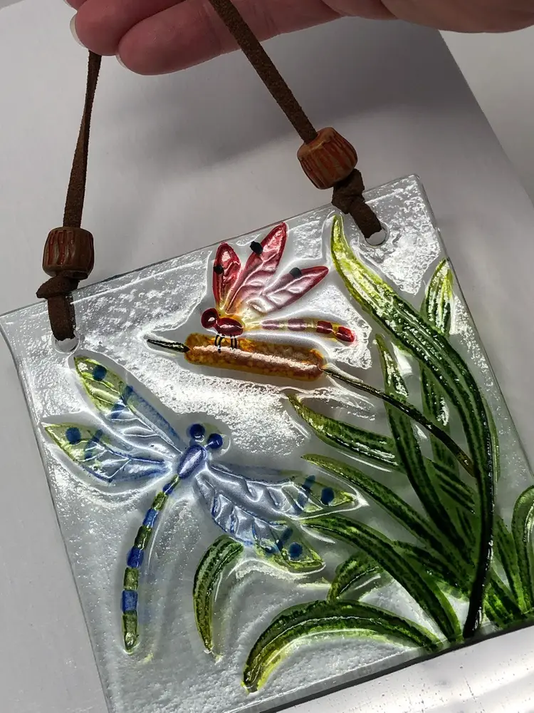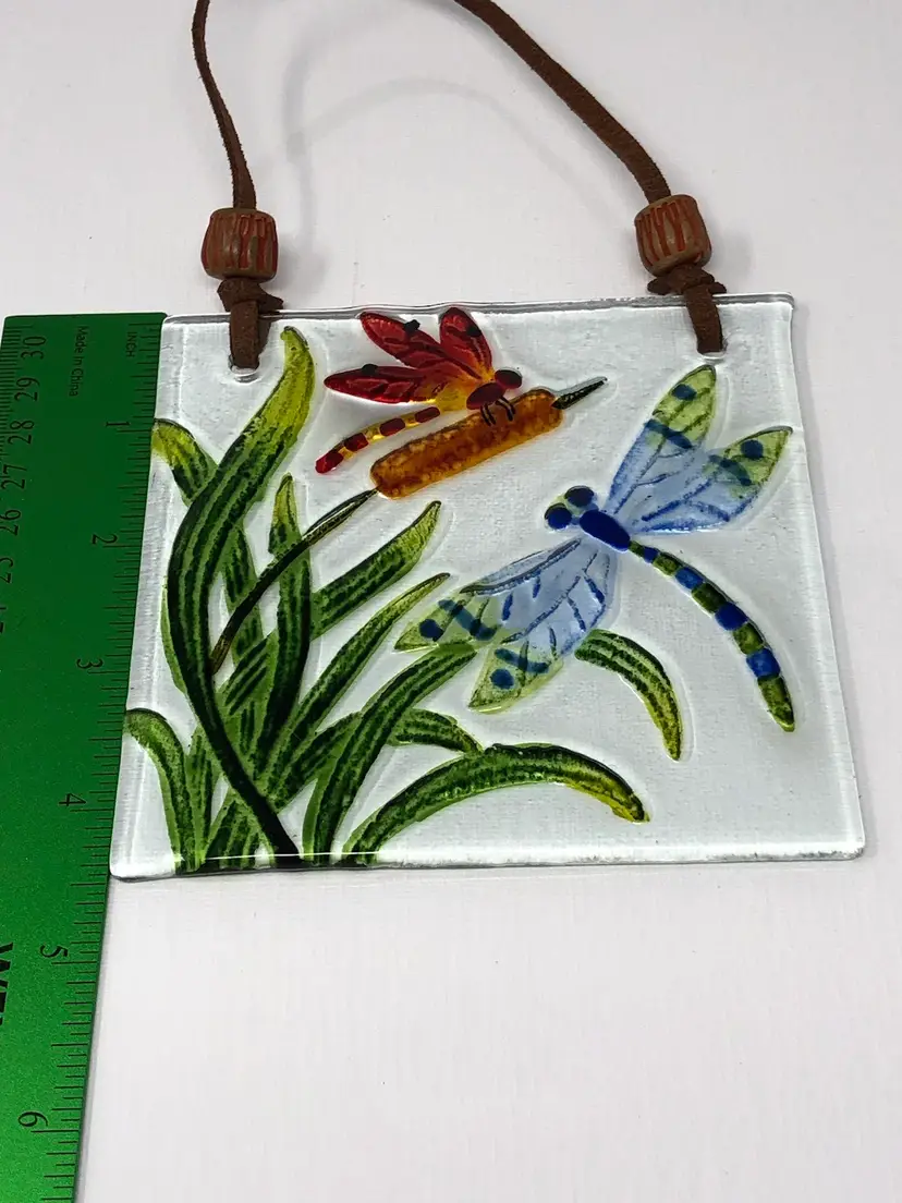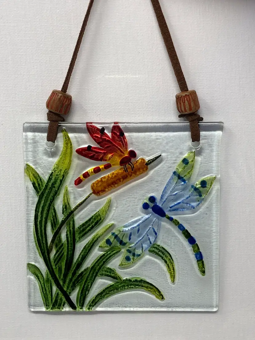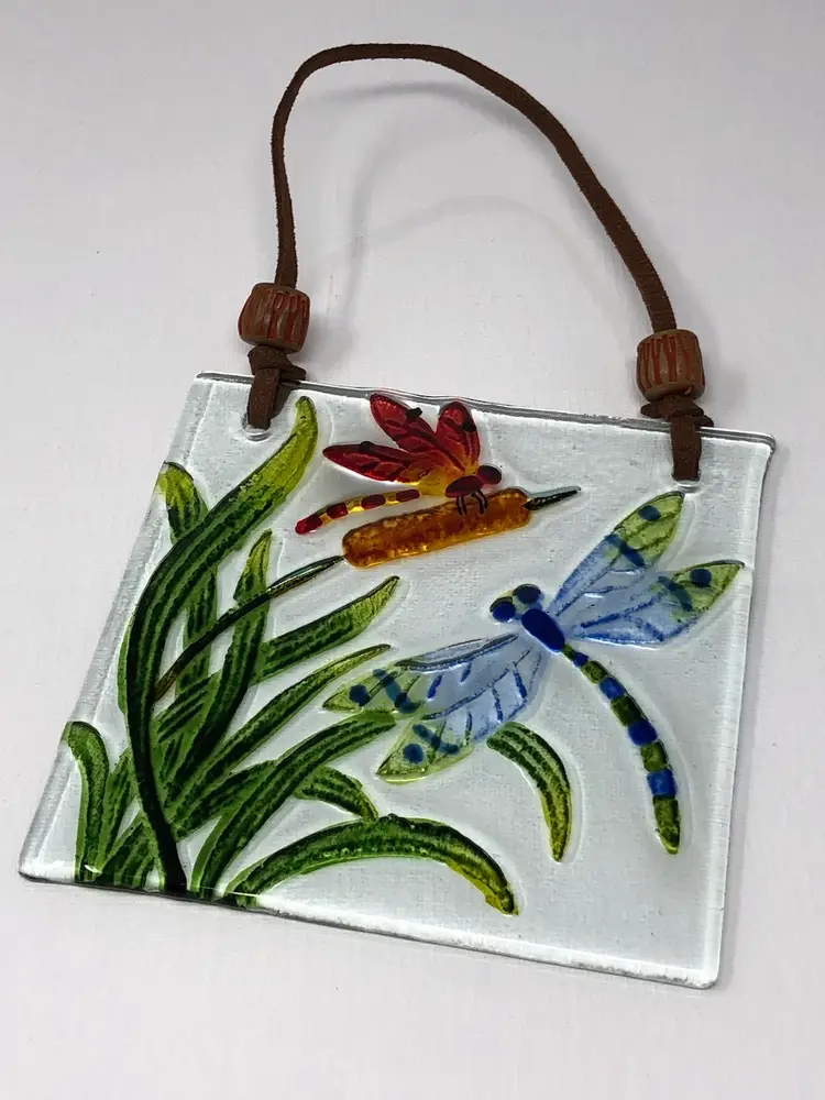 4 1/2" art glass suncatcher with reverse painted dragonflies on cattails. Leather cord for hanging. No markings or labels, no chips or cracks.