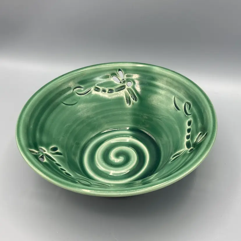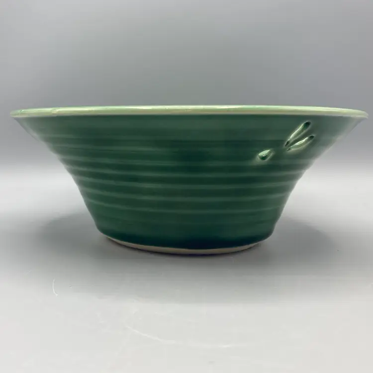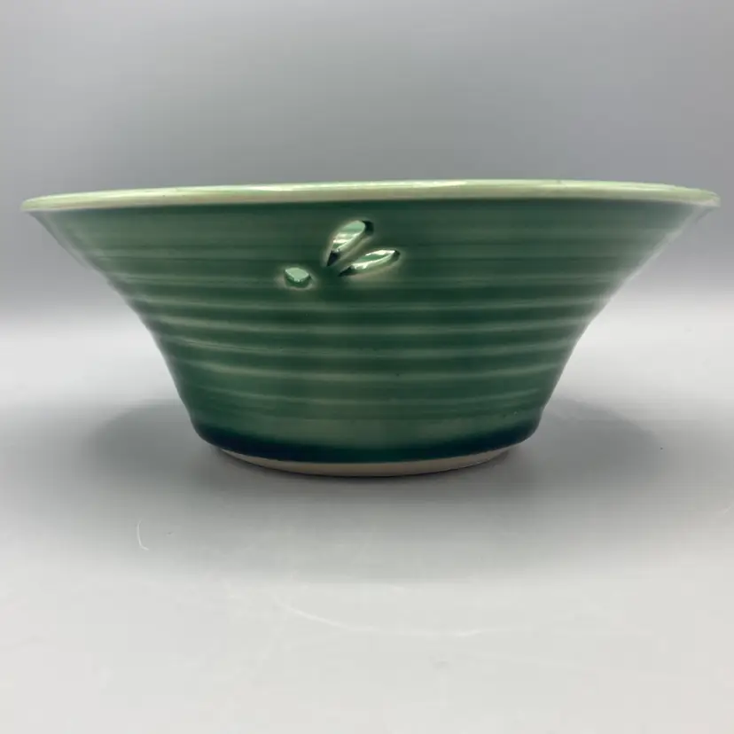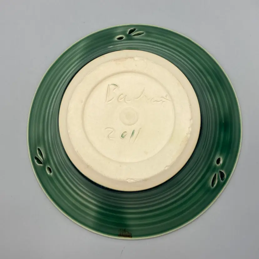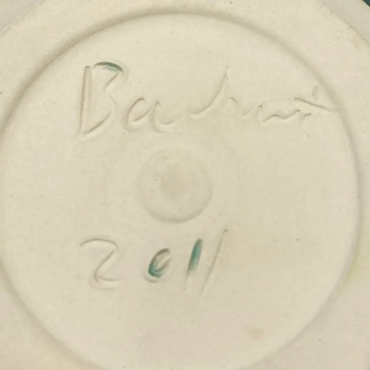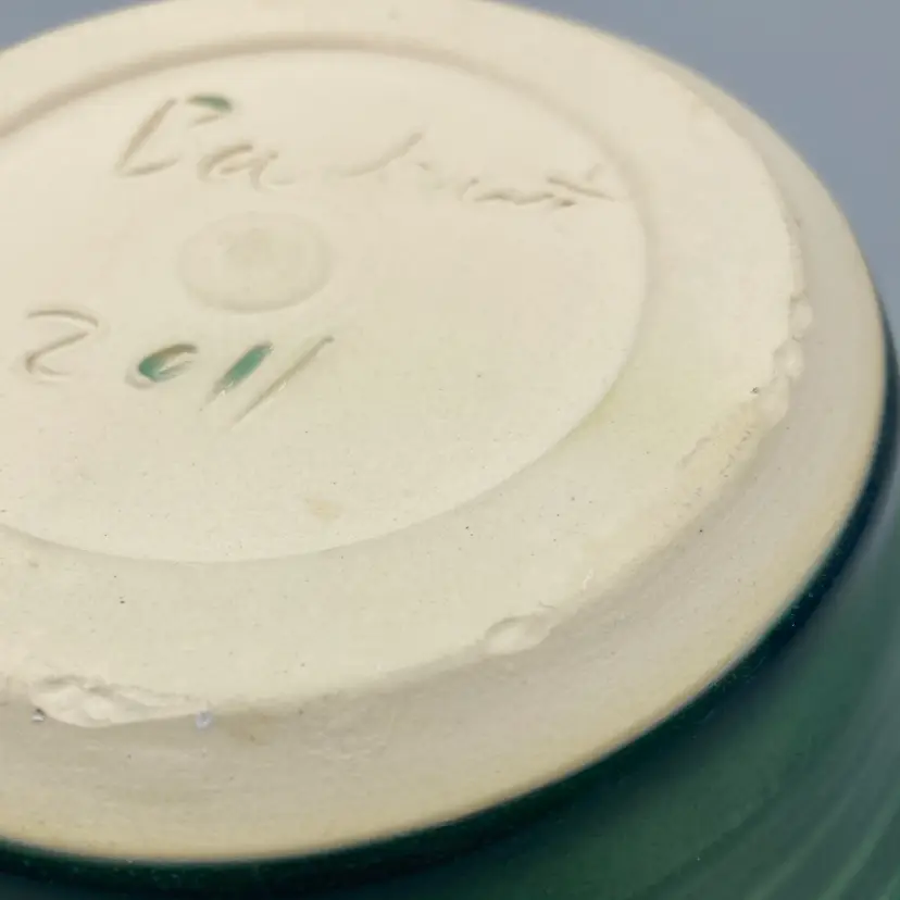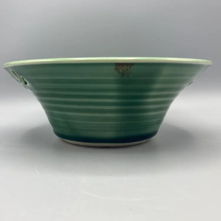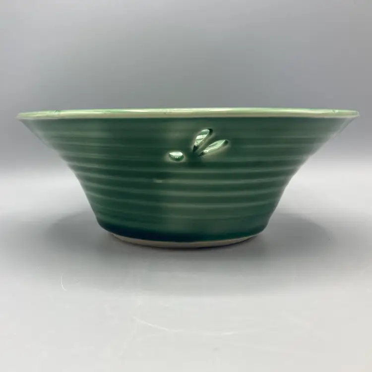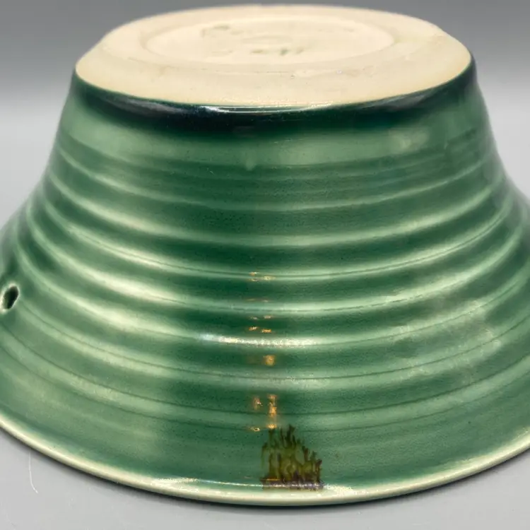 This pretty bowl is signed and dated by the artist and is in good condition. The only thing to mention is a little paint/glaze that is a different color that the main part of the bowl and the bottom has small chips, all visible in the pictures. The bowl measures 7 1/4" across the top, 4" across the bottom, and 3" tall.