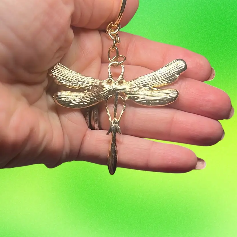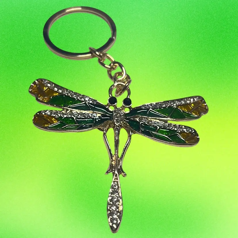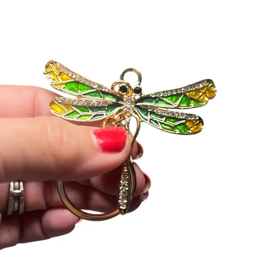 Dragonfly Key Chain - Gold Tone With Colors If Green Wings And Clear Rhinestones - Contemporary