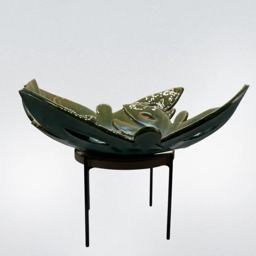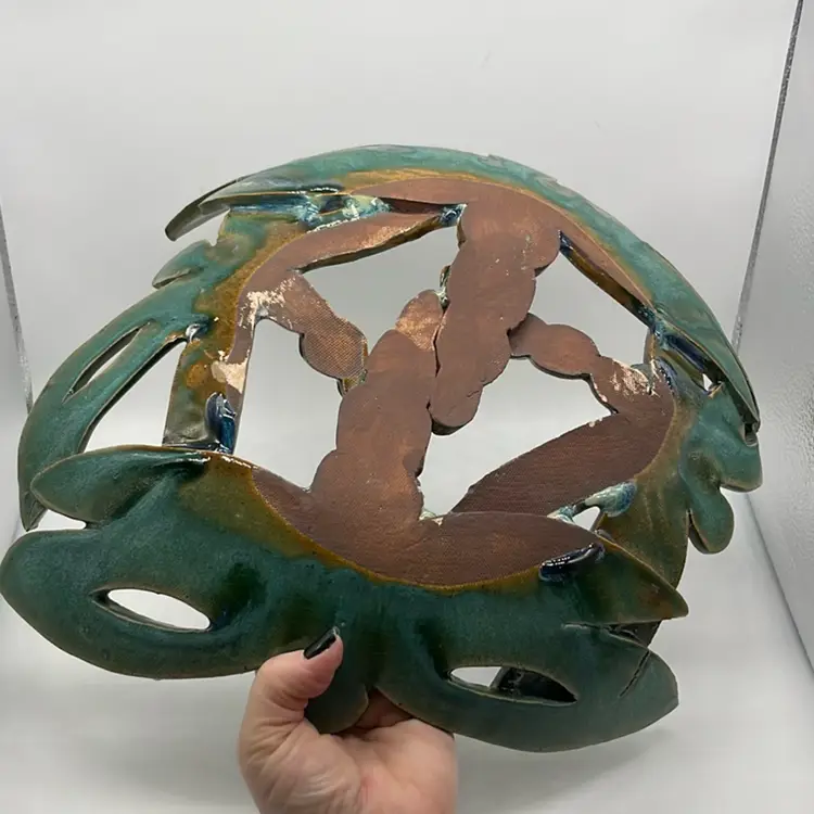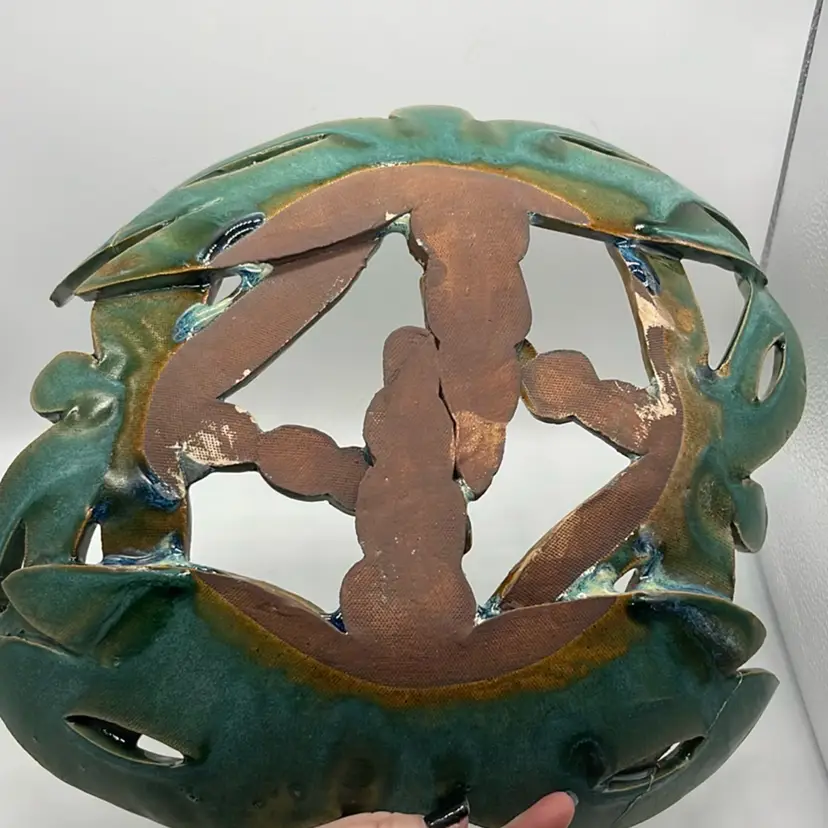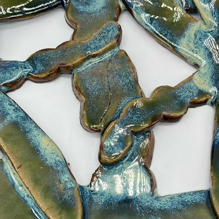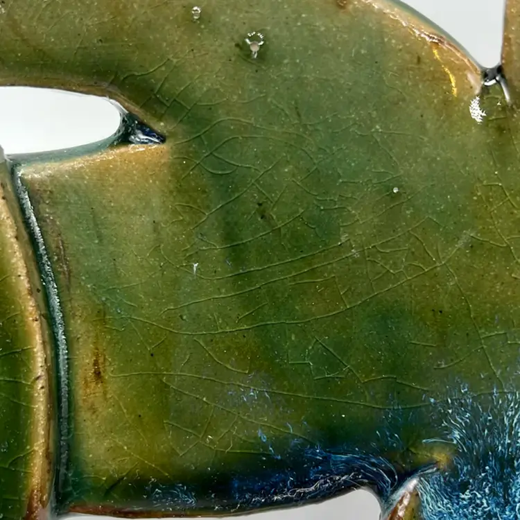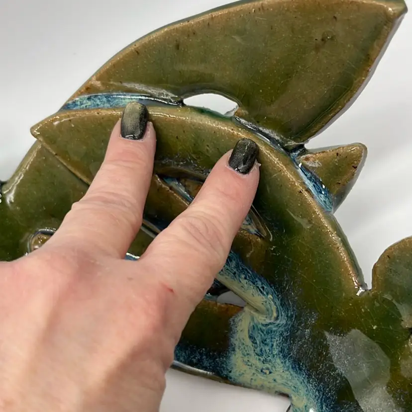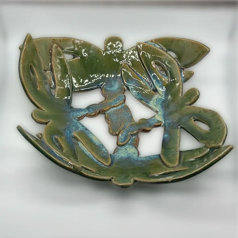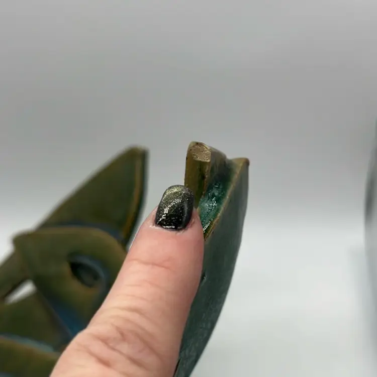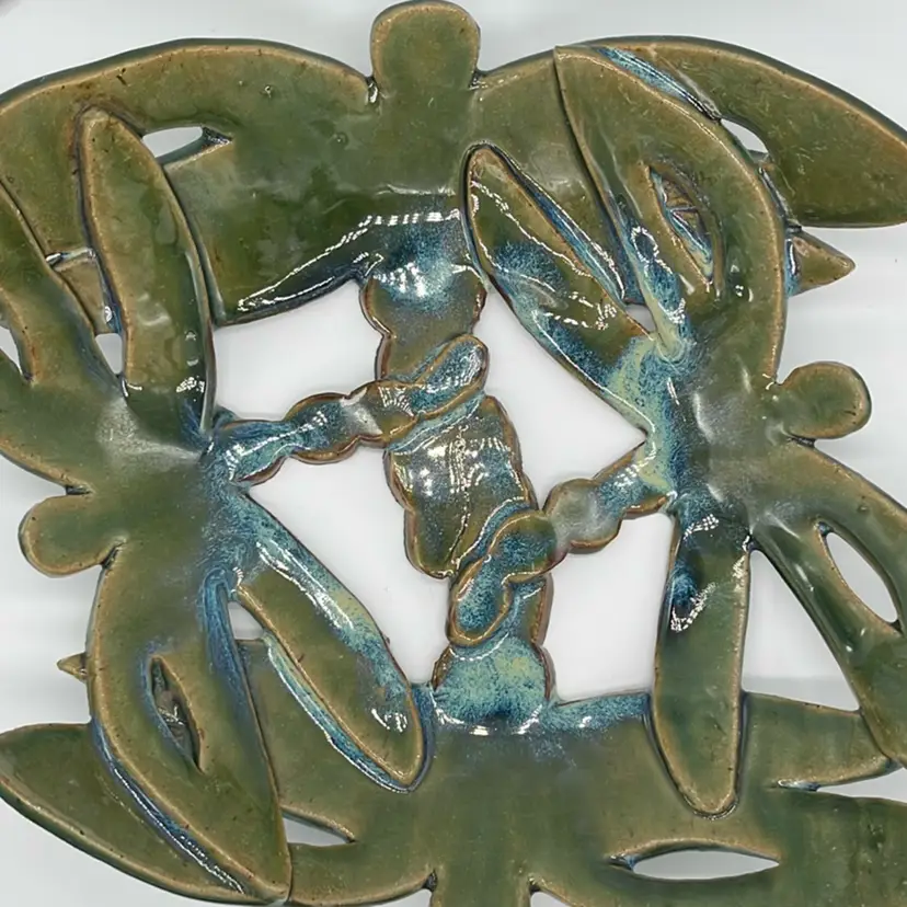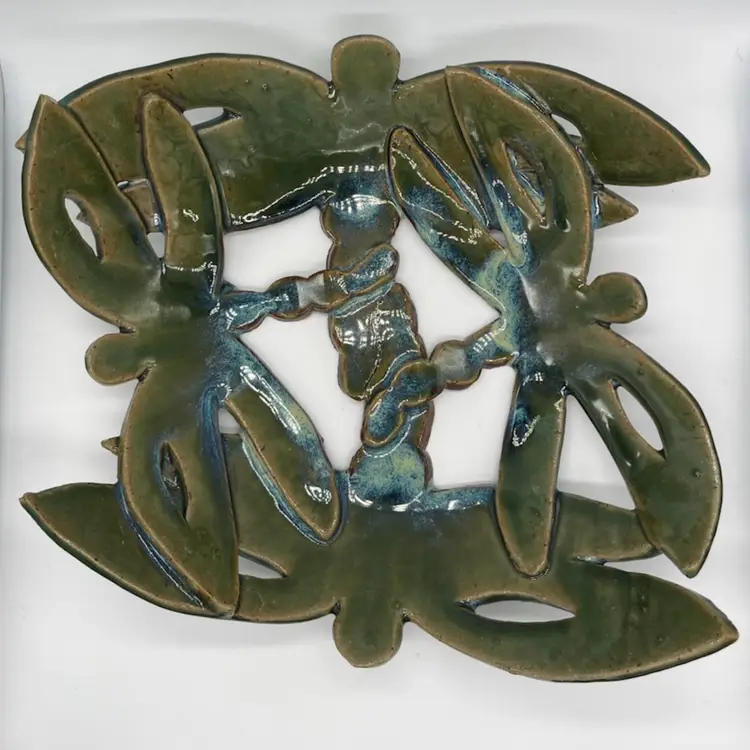 4 Dragonflies connecting their beauty! This piece is amazing! (Even with the repair, see pics) Although it is not signed, it is done really well! Repair done well on one wing, small minor chip at end of one wing (see pics) ** Will ship alone and will be double boxed for protection and extra caution for the repaired area. Does show crazing throughout. Approx: 14” at widest x 12”w x 4” h