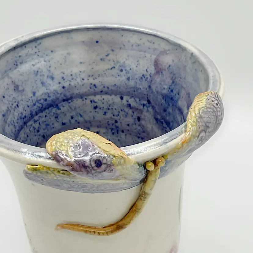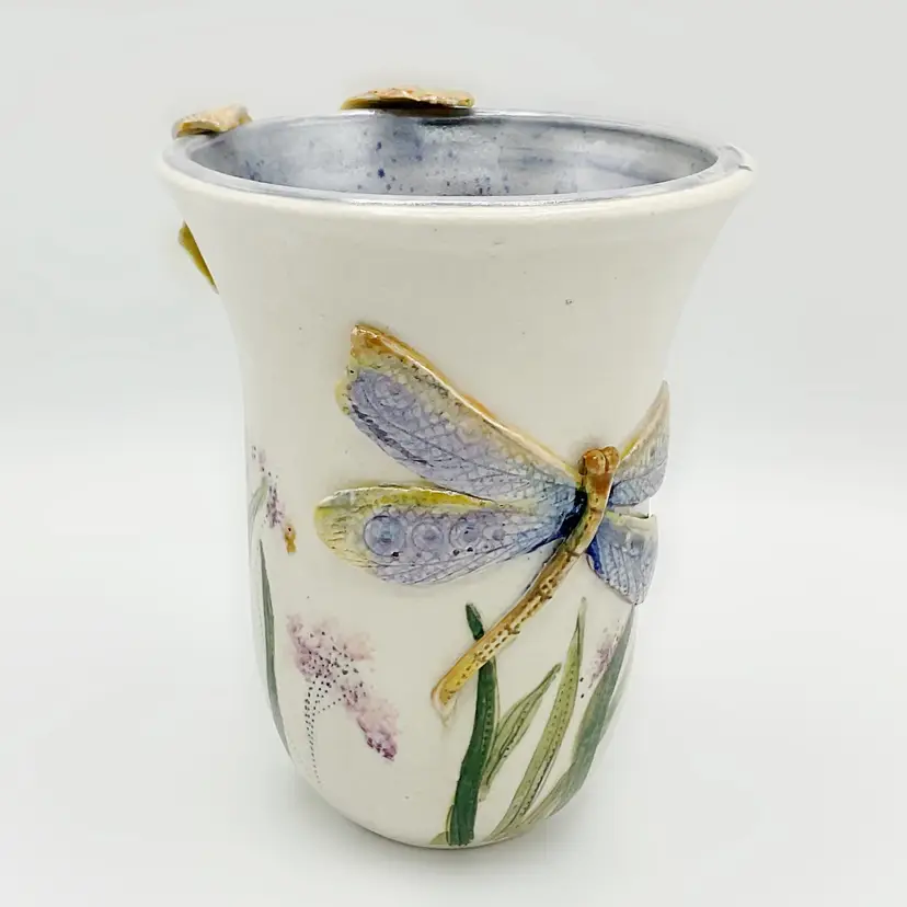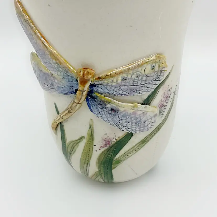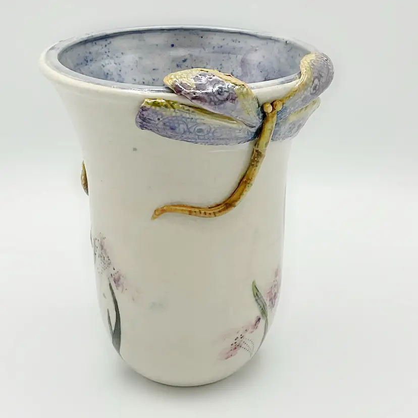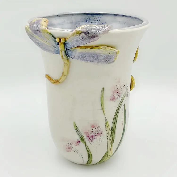 Handmade vase featuring applied dragonflies and painted flowers on natural clay colored background. Satin clear crackle glaze or it could be crazing. Contrasting blue and lavender glaze on the interior. Artist signed on the bottom. J.Praznik It’s in excellent condition. Any thing that looks like it might be a flaw is part of its charm and was intended by the artist.