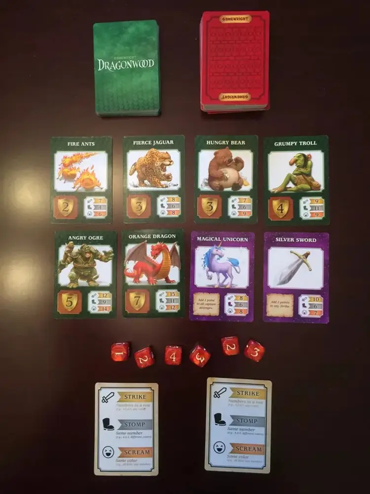 The game includes six, six-sided dice with sides 1, 2, 2, 3, 3, and 4 to reduce extremely lucky outcomes. The Dragonwood deck has 42 cards, 5 of which are displayed in the landscape at any time. In addition to creatures, this deck also has enhancements that are captured in the same way as creatures which assist players in capturing creatures, and contains events that also impact play. When both dragons have been defeated, the game is over and the player with the most victory points wins!
