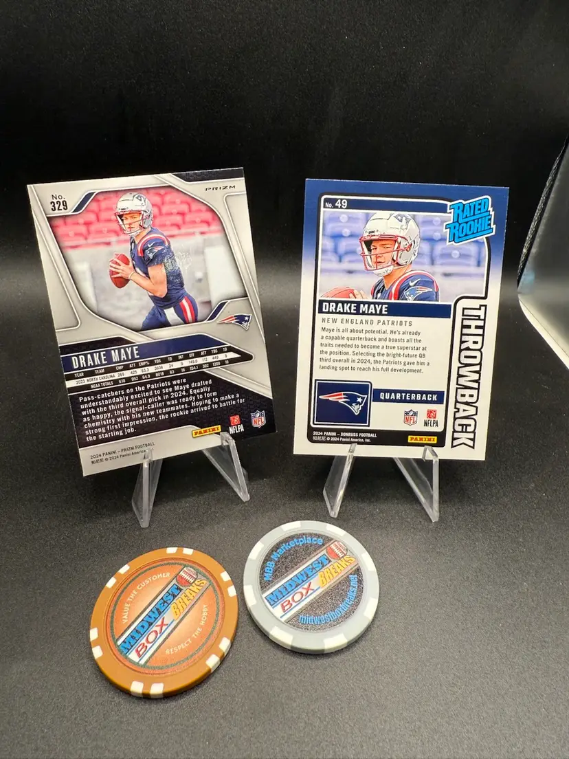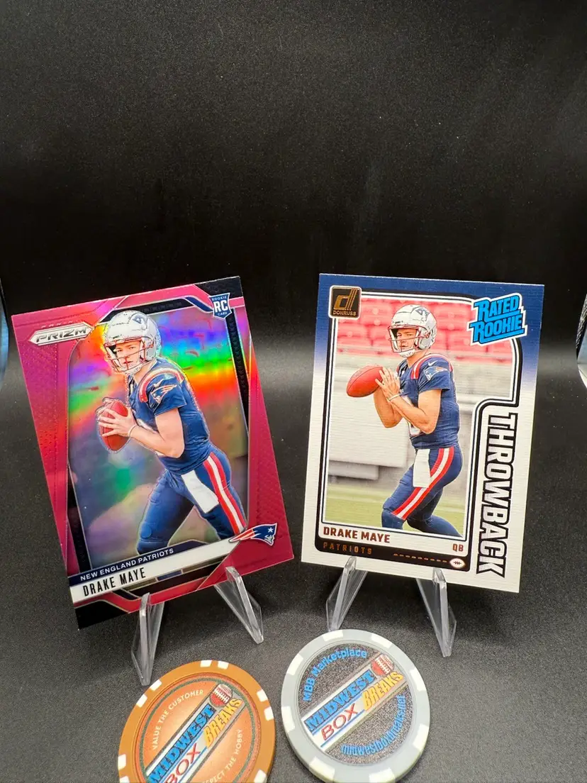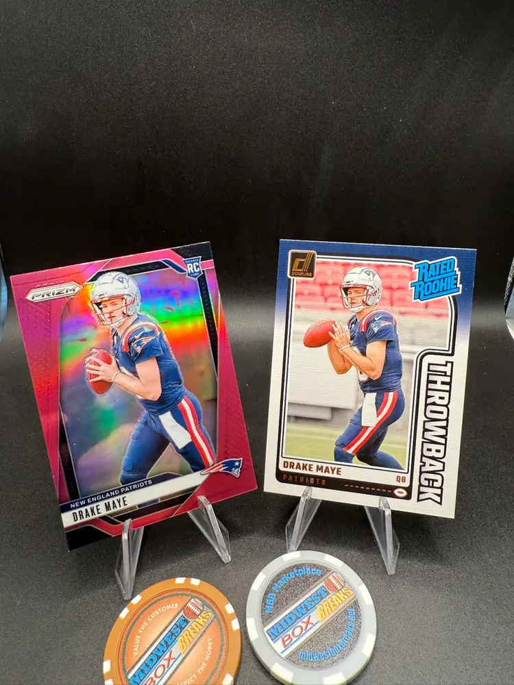 Drake Maye 2024 Donruss throwback rookie and 2024 Prizm pink parallel. Prizm has a few dimples that are sometimes typical in Prizm cards.