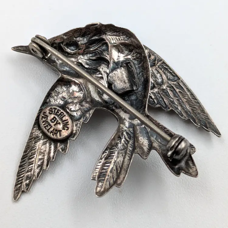 Dramatic vintage brooch featuring a detailed silver-tone bird in flight. The pose gives some renaissance/flemmish art history energy. Rollover clasp on the back. Signed on the back Sterling by Jewel Art. I have not tried to polish this piece, leaving that up to the buyer if they like the patina or not. Magnet tested.