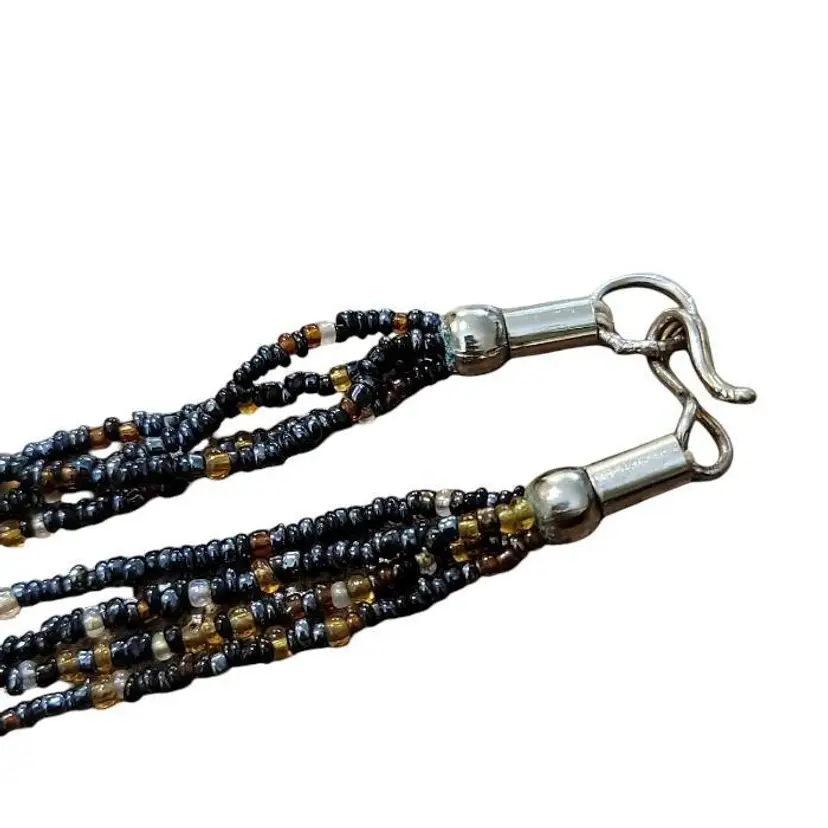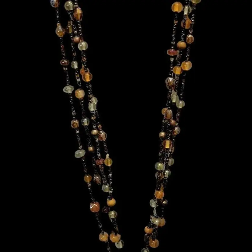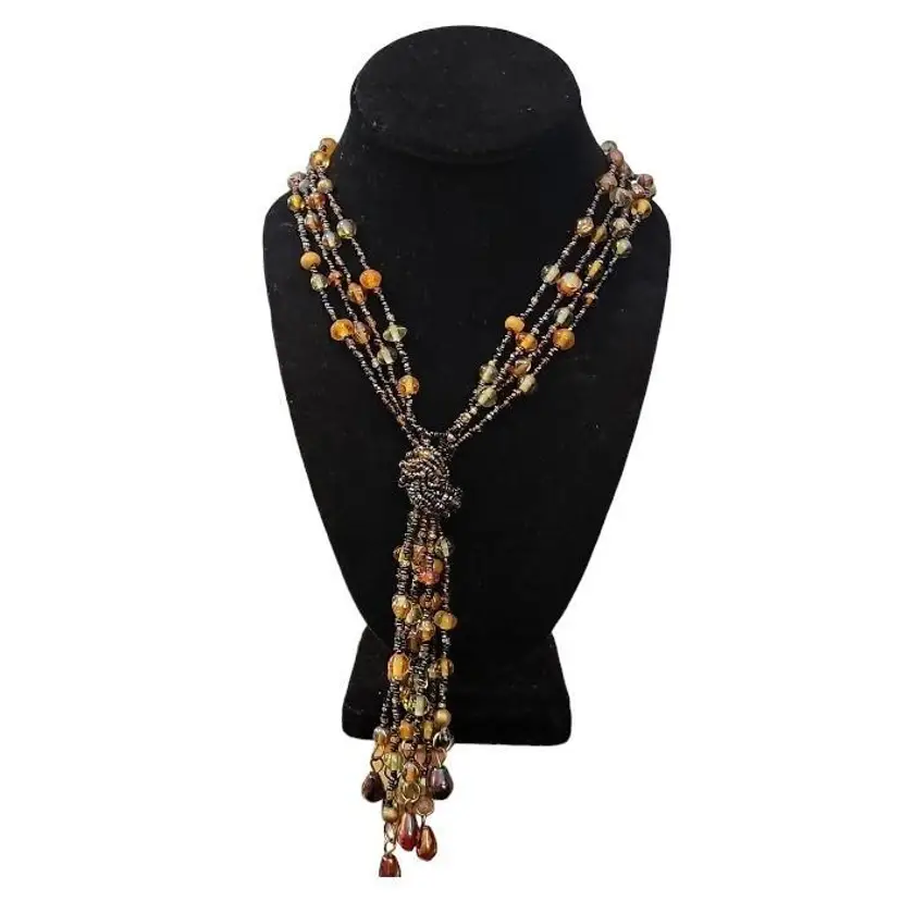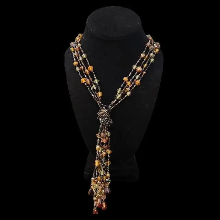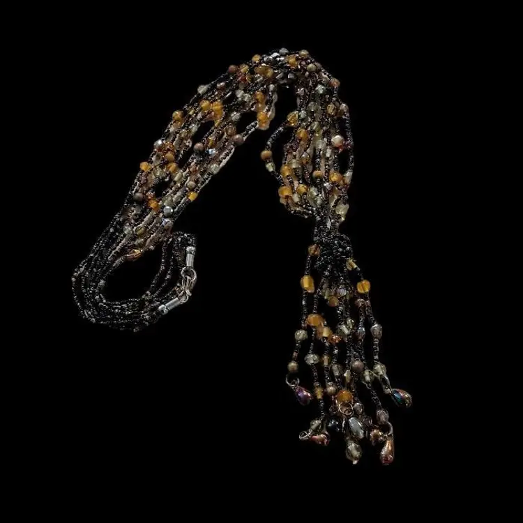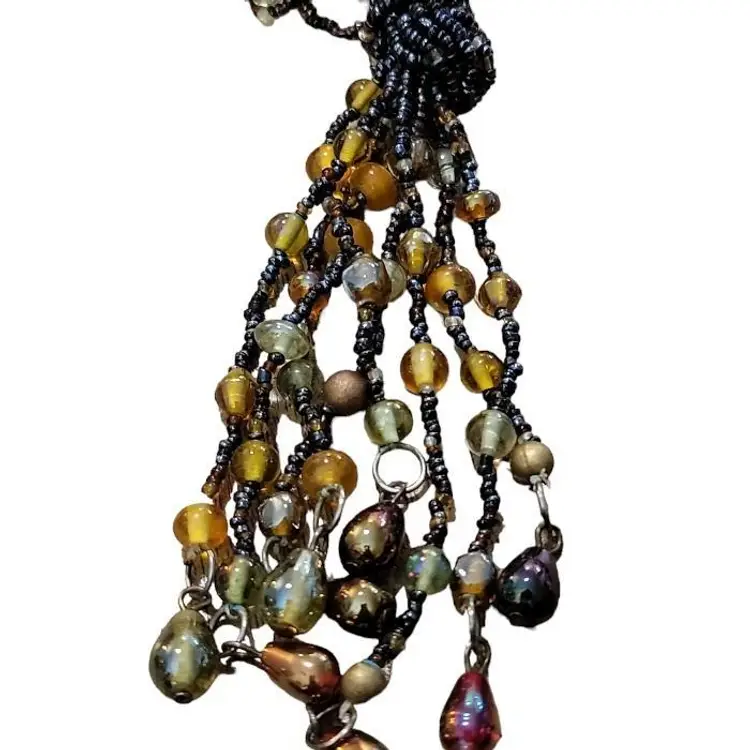 Add a touch of glamour to your look with this stunning vintage 4 strand fringe necklace. The necklace boasts a beautiful amber color glass bead design and black tiny seed beaded chain. The necklace measures 36 inches in length and features a unique fringe of pear shaped metal baubles of different colors. The fringe adds another 4 1/2" to the drop!