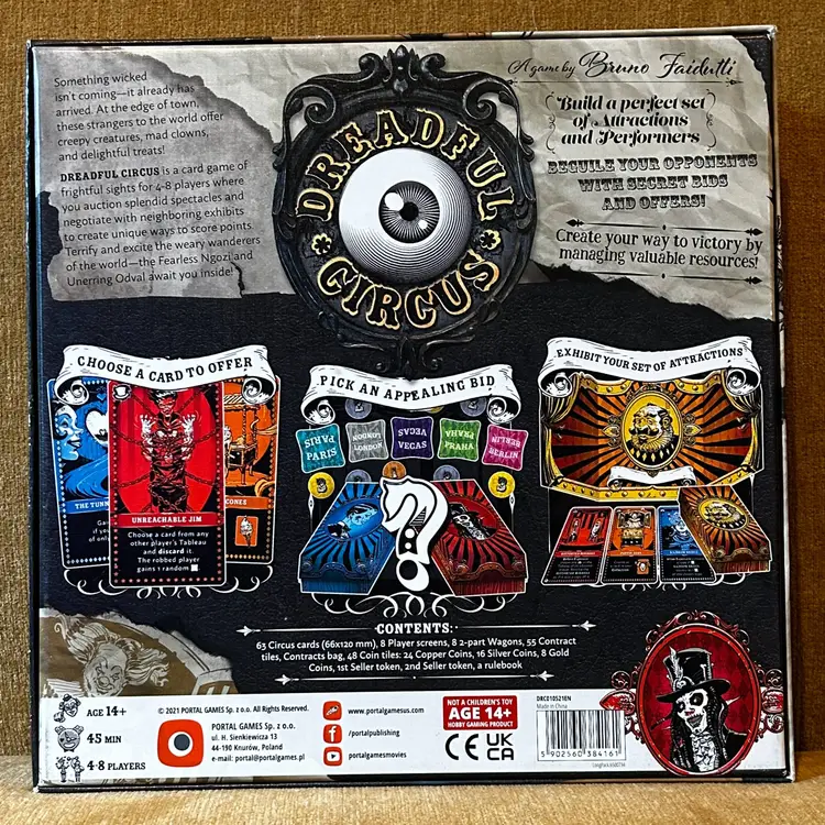 Dreadful Circus is a set-collection card game in which players try to create the most successful circus! The game comes with an unique twist: Over the course of the game, players buy cards that have special final scoring rules. As the game progresses and more cards are gained, each player develops their very own final scoring rules. No game is the same, and no player at the table scores the same way.