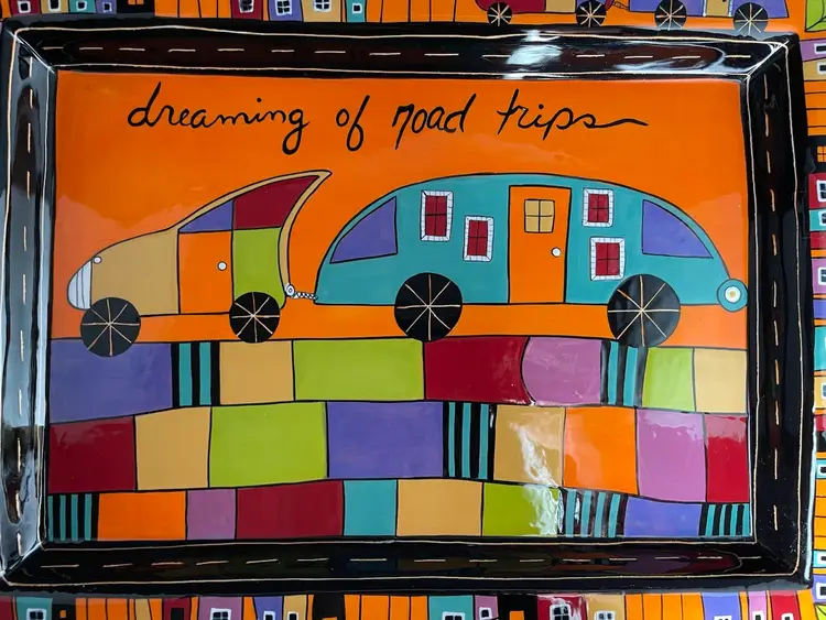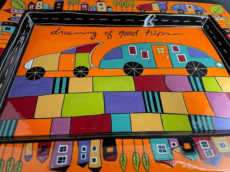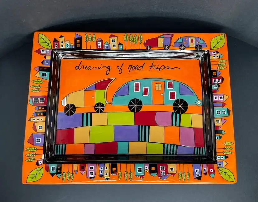 This whimsical serving tray is perfect for any occasion and will add a touch of boho style to your dining experience. Featuring a travel trailer pattern and a glossy finish, this rectangular tray is made of high-quality ceramic material. Measuring 15 inches in length and 11.25 inches in width, it is large enough to serve your favorite snacks or drinks. The tray also comes with a unique camping theme, making it a great addition to any collection. Whether you're serving guests or simply enjoying a solo snack, this tray is sure to impress.
