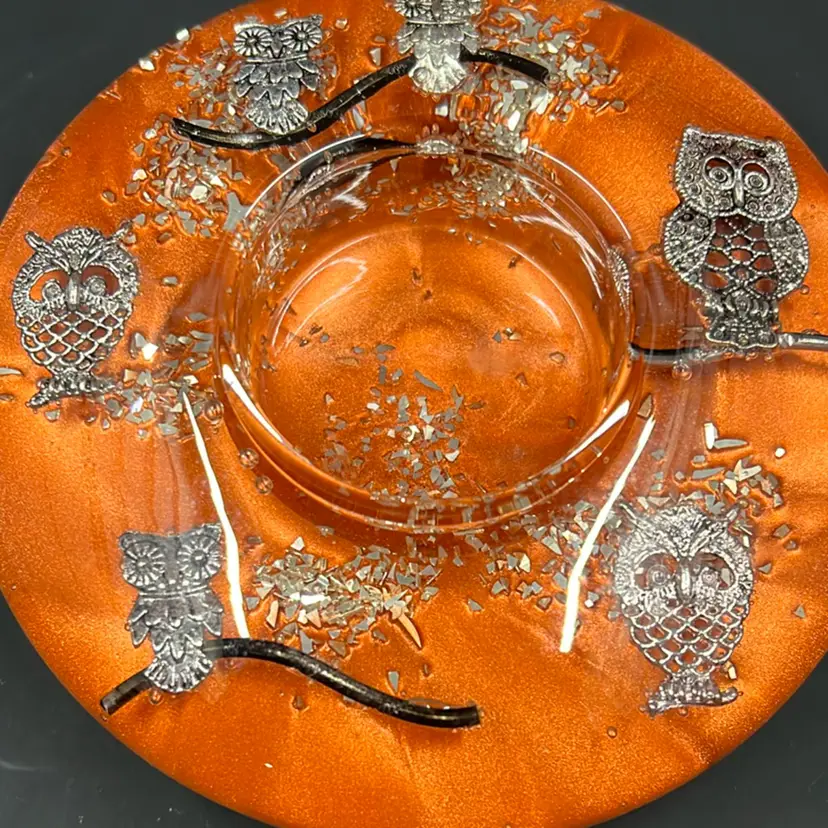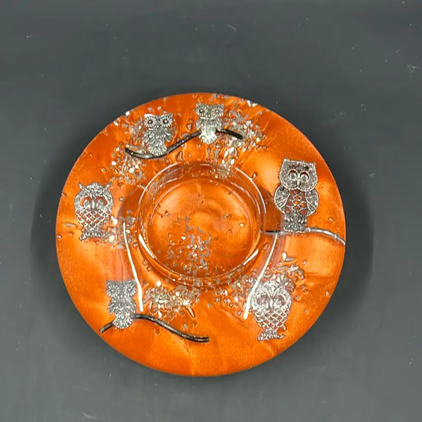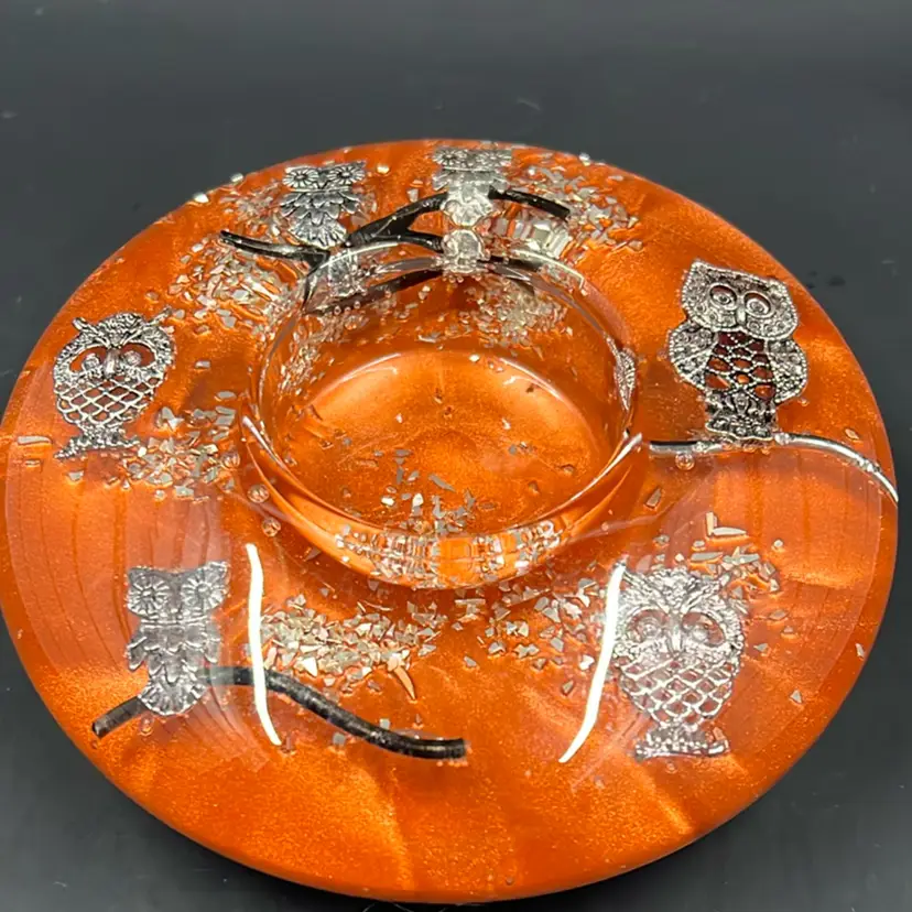 Measures 4.25 inches wide Excellent condition Made of resin with silver toned owls.
