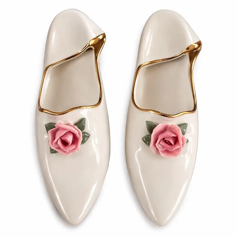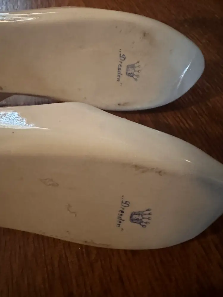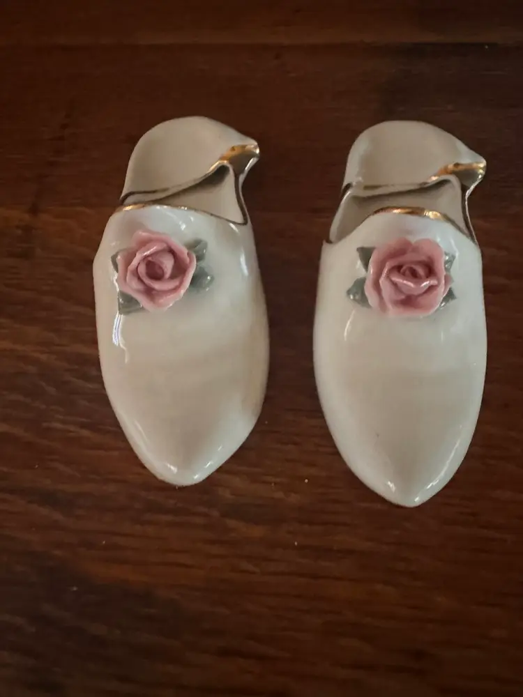 This pair of objects are vintage Dresden porcelain slipper figurines, often used as decorative pieces, ring holders, or ashtrays. These collectible ceramic shoes typically feature a white glaze, delicate hand-applied pink roses, and gold-trimmed edges.no chips or cracks. Excellent condition.