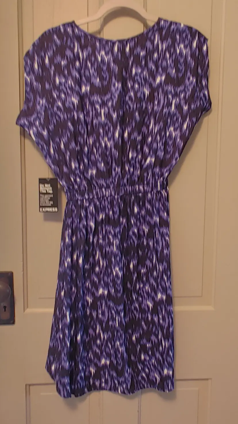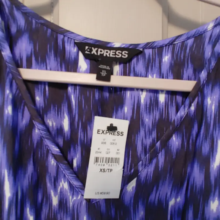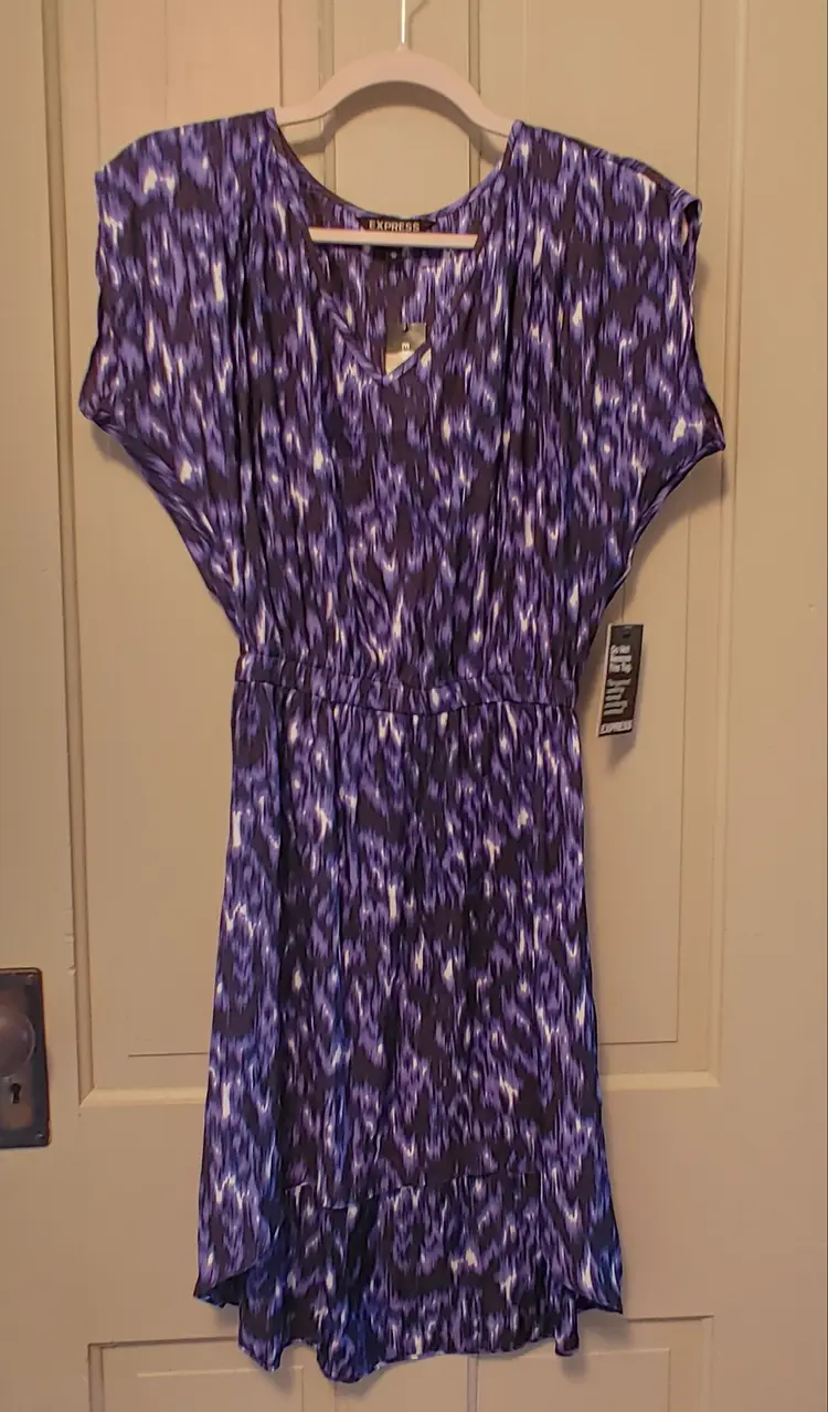 Dress- Brand: Express. Size XS. NWT. Retail $59.90. Black, blue, purple dress. Material- 100% polyester. No callouts.