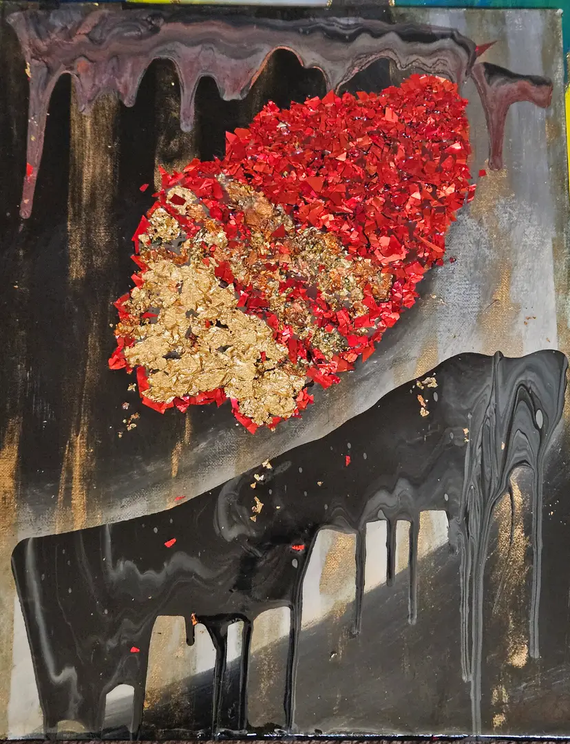 16"W x 20"H Original painting The background is acrylic paint with gold dust brush strokes, while incorporating a marble effect using the resin paint pour method. In the center of the painting is the side of a woman's face filled with gold and red flakes.