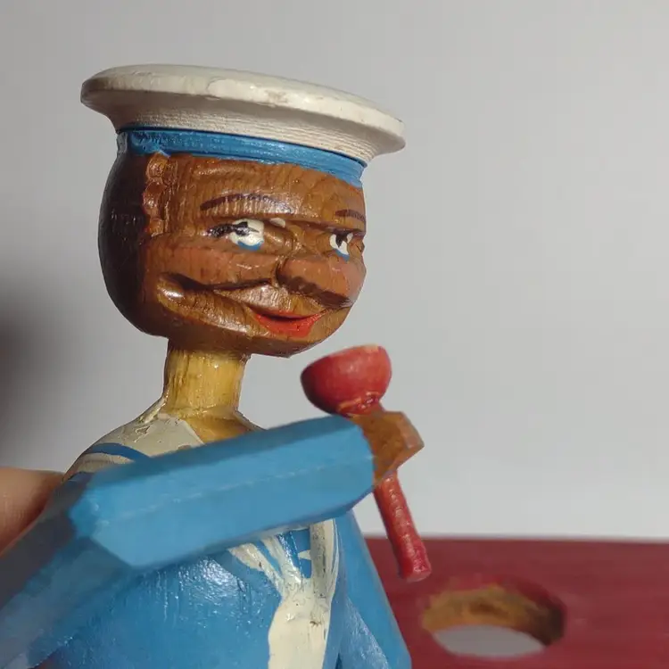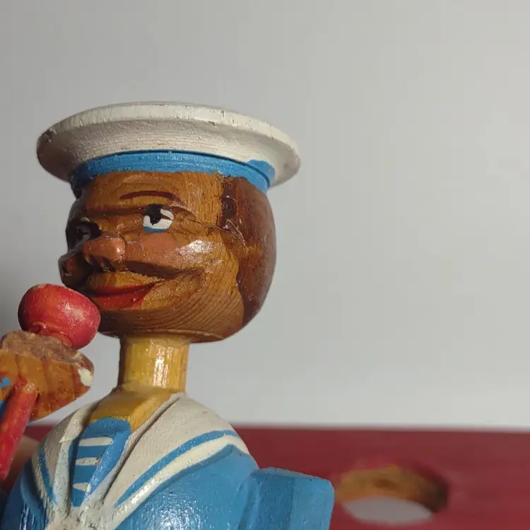 This ANRI wood carving depicts a sailor holding a bottle, ready to add a nautical touch to any bar or room. The small, asymmetrical figure features intricate carvings and colorful details, making it a unique and charming collectible from the 1950s. The handcrafted bottle stopper is perfect for all occasions and is suitable for any room. Its European style and sailor theme add character to any barware collection. This original ANRI wood carving is a vintage piece from Italy and is sure to be a conversation starter at your next gathering.