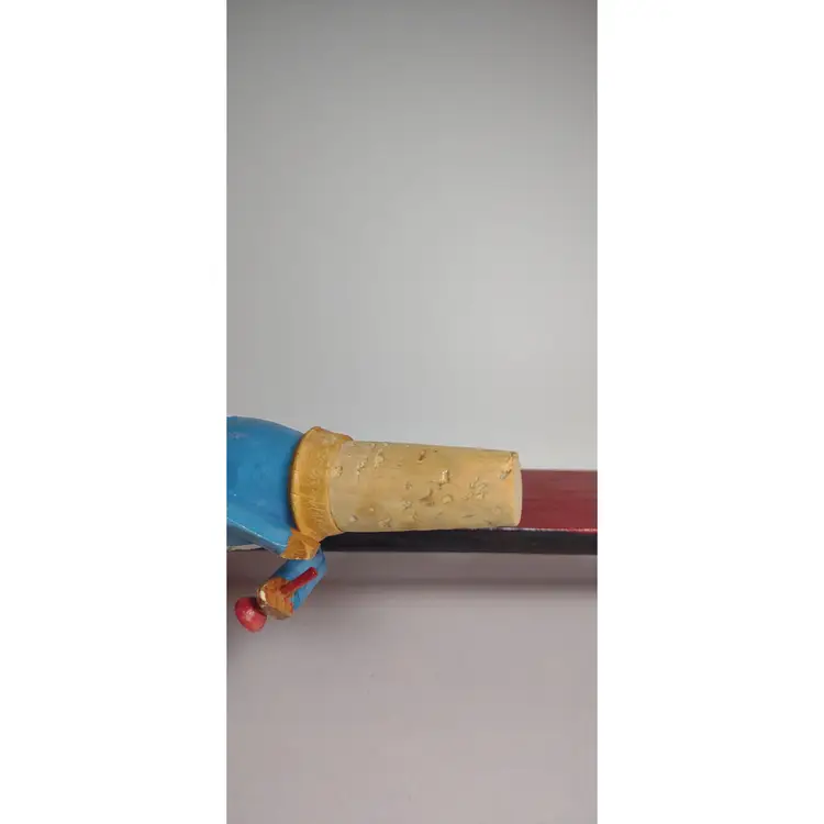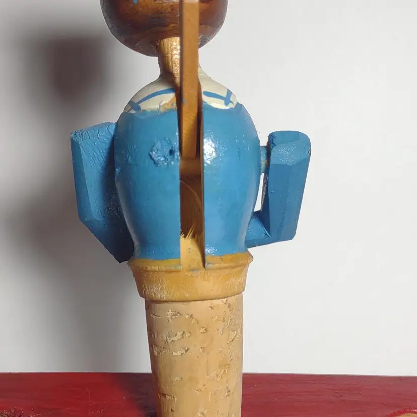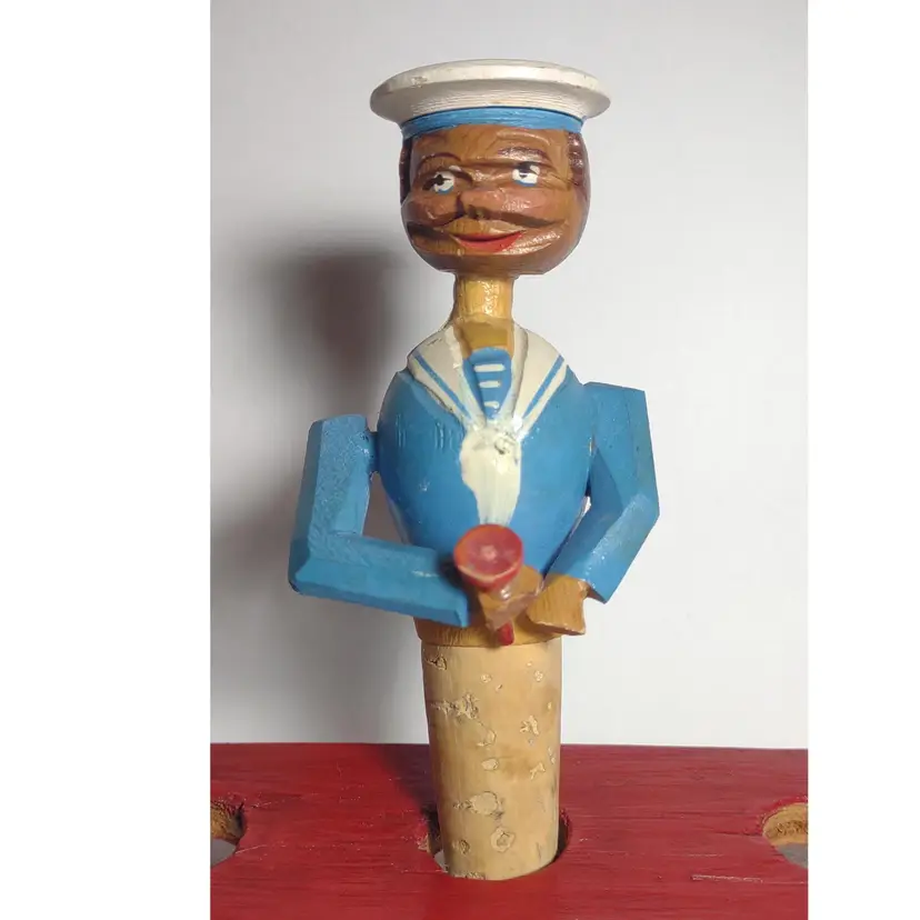 Hard to find version with wooden face. ANRI vintage hand carved and hand painted wood mechanical bottle stopper. Perfect working condition. Pull the lever and and he moves his arm and drink to his mouth. Size is 4.75" tall. Has light paint age wear. Cork base has some age wear. STAND NOT INCLUDED.