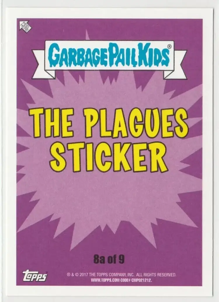 Related ID: overourheadz Card Size: Standard Autographed: No Set: Adam-Geddon Subset: The Plagues Sticker Store ID: American Pop Cult Year Manufactured: 2017 Material: Card Stock Franchise: Garbage Pail Kids Original/Licensed Reprint: Original Vintage: No Series: 2017 Adam-geddon AG Type: Non-Sport Trading Card Language: English Mononym: overourheads Manufacturer: Topps Features: Base Set, Sticker Genre: Comedy, Parody, Satire Card Type: trading card sticker Country/Region of Manufacture: United States