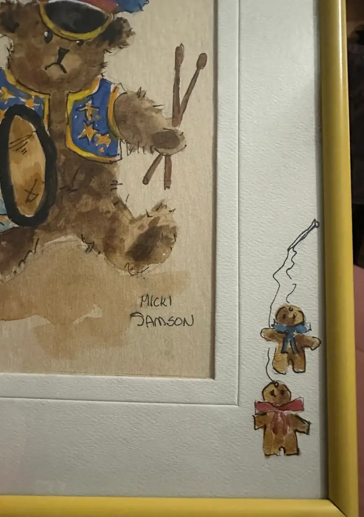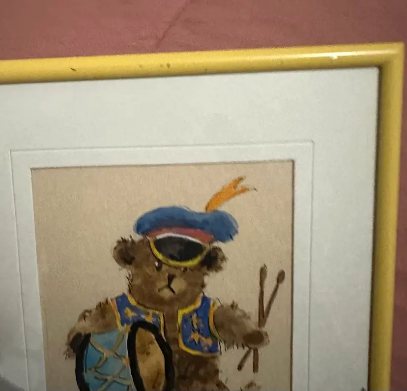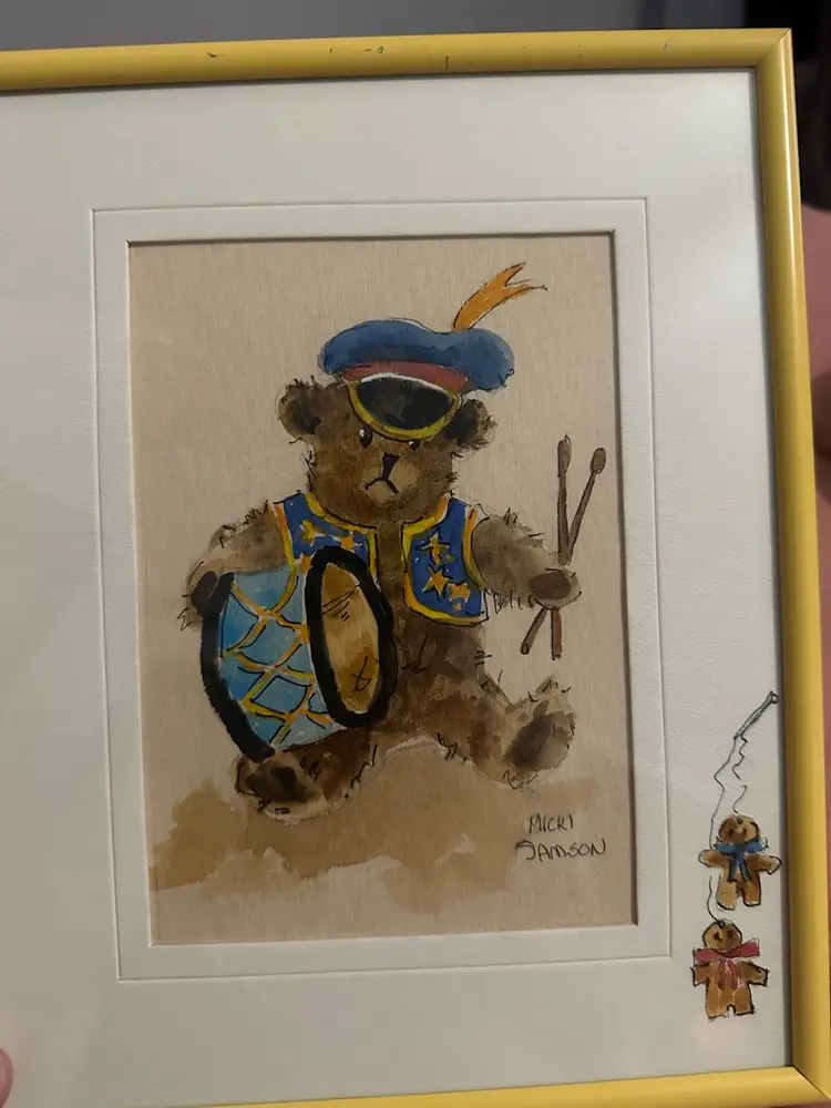 The painting is an original signed watercolor by artist Micki Samson featuring a drummer bear. The 8x10 framed artwork is from the United States, adding a unique touch to any music or animal enthusiast's collection. The charming illustration captures the essence of music and creativity, making it a delightful addition to any space. Some service scratches to the frame see pictures.