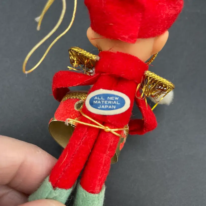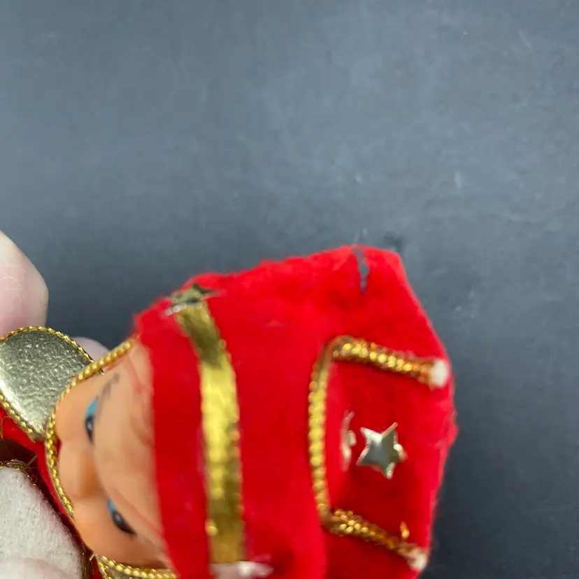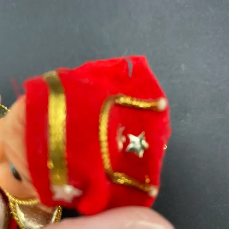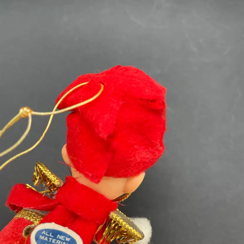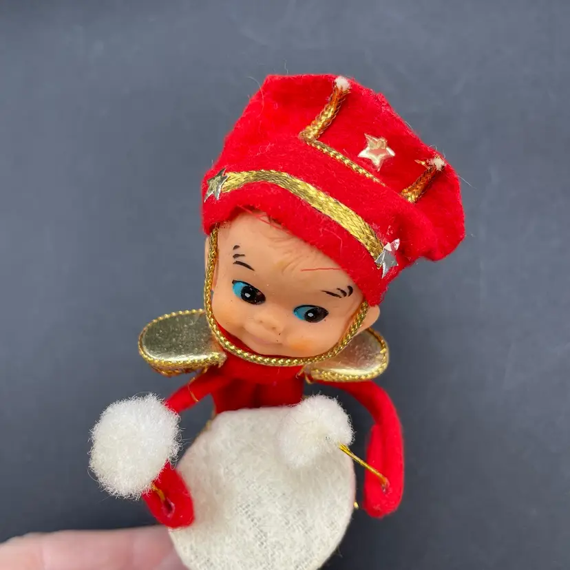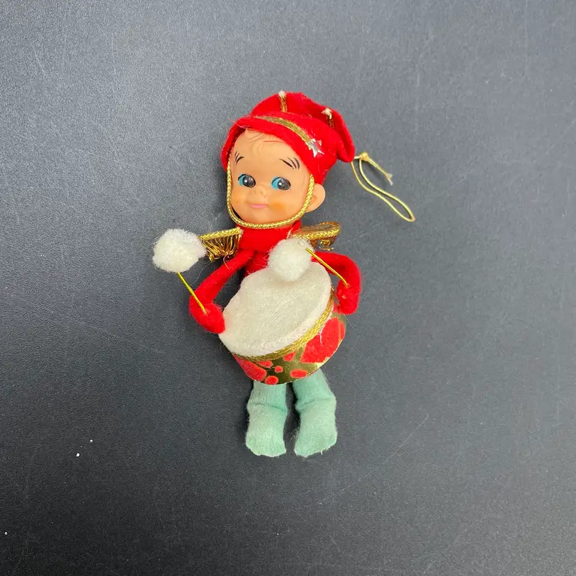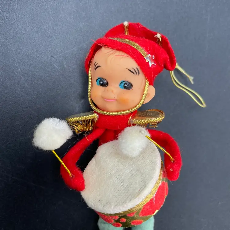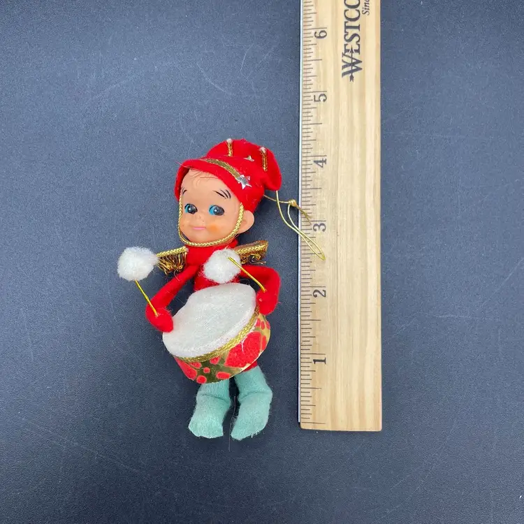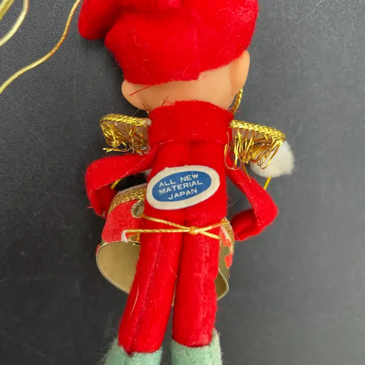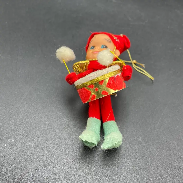 This is a vintage drummer boy hanging ornament. His head is plastic while his body is felt. Made in Japan. Measures approximately 4" long. His hat has a small rip on one side as shown in pictures. No other major flaws.