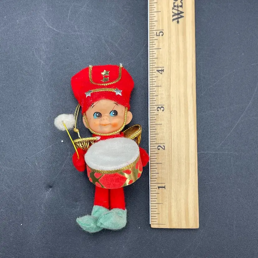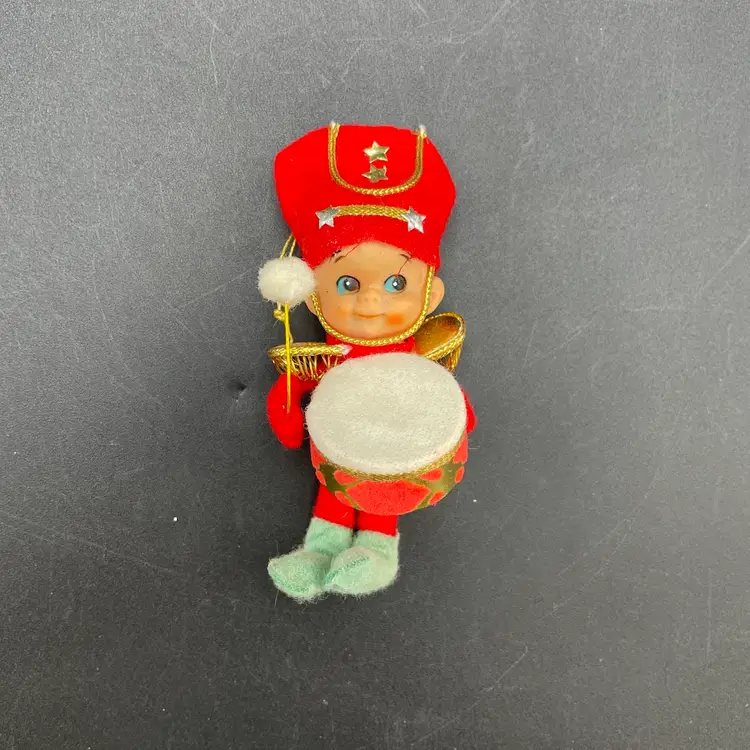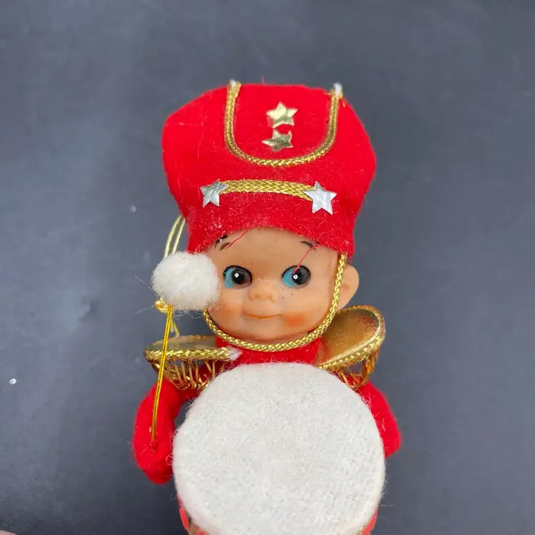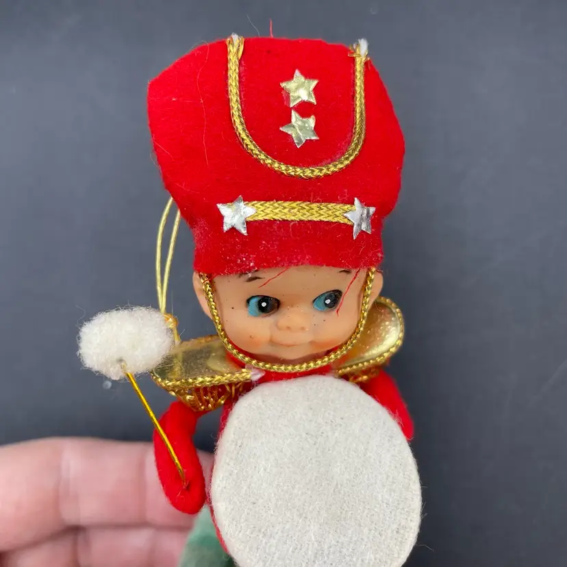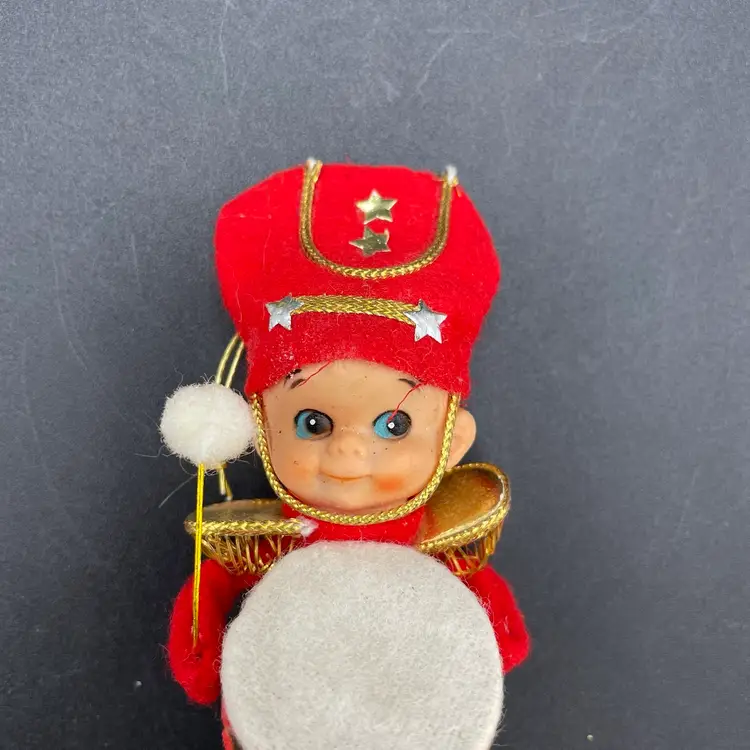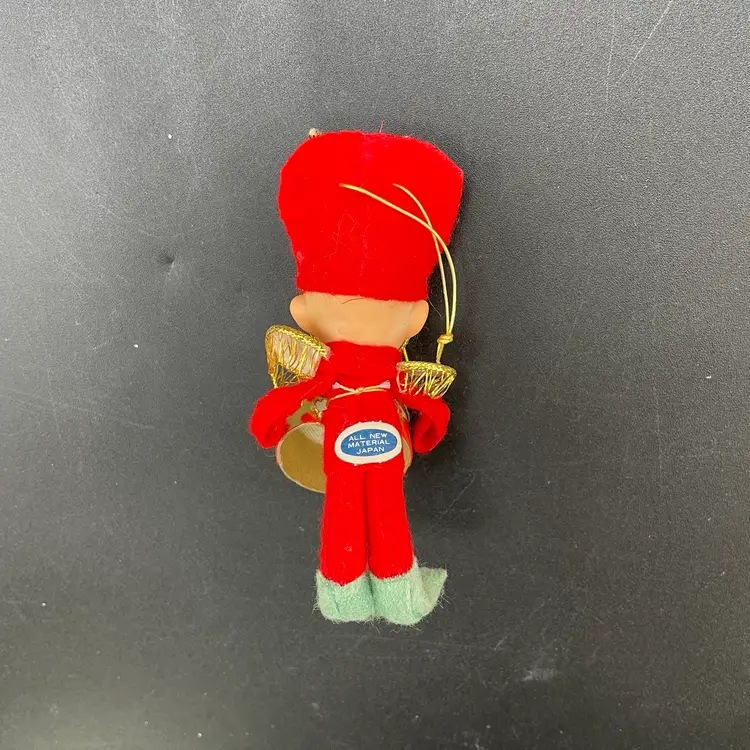 This is a vintage drummer boy hanging ornament. His head is plastic while his body is felt. Made in Japan. Measures approximately 4" long. His face has some marks due to age and use, and a drumstick is missing. Both are shown in pictures. No other major flaws.