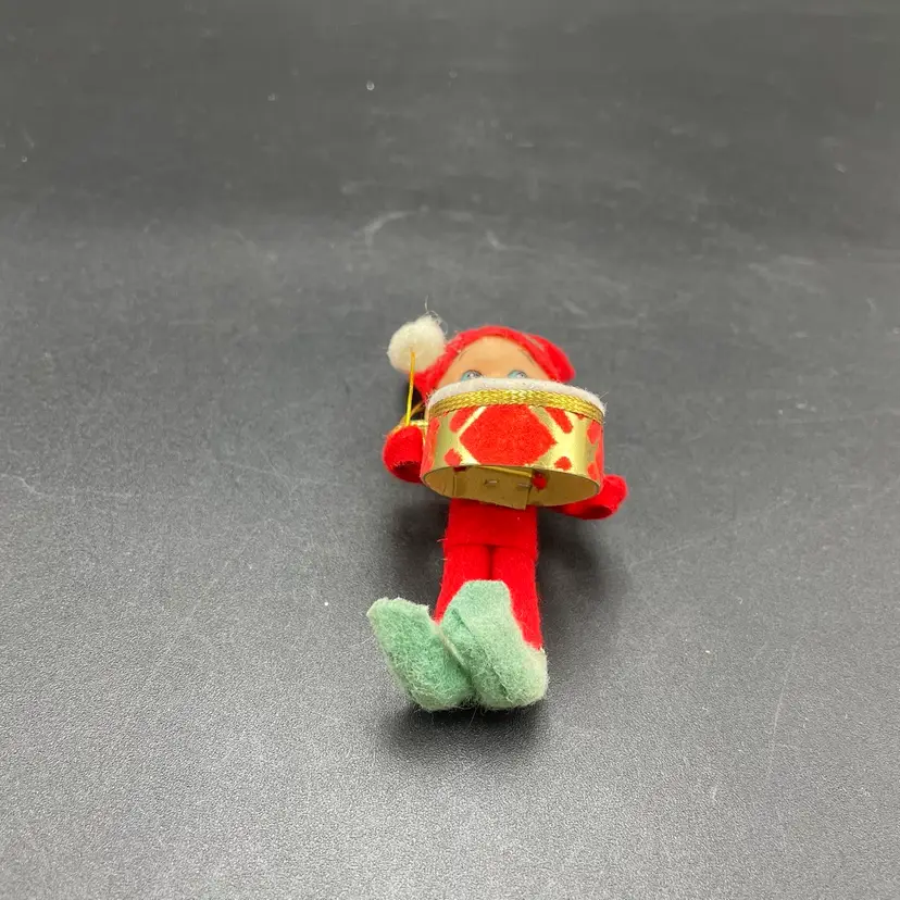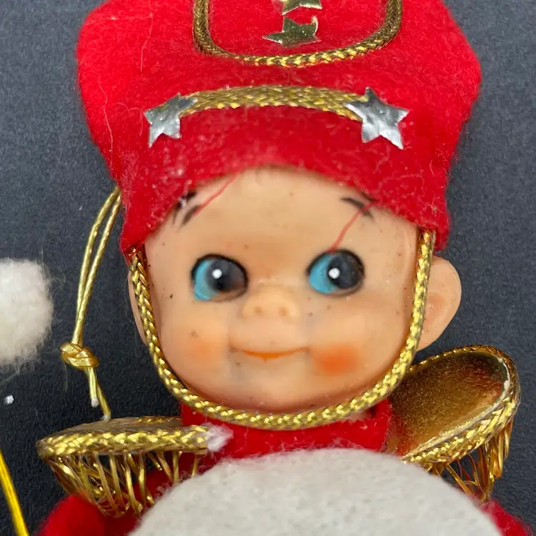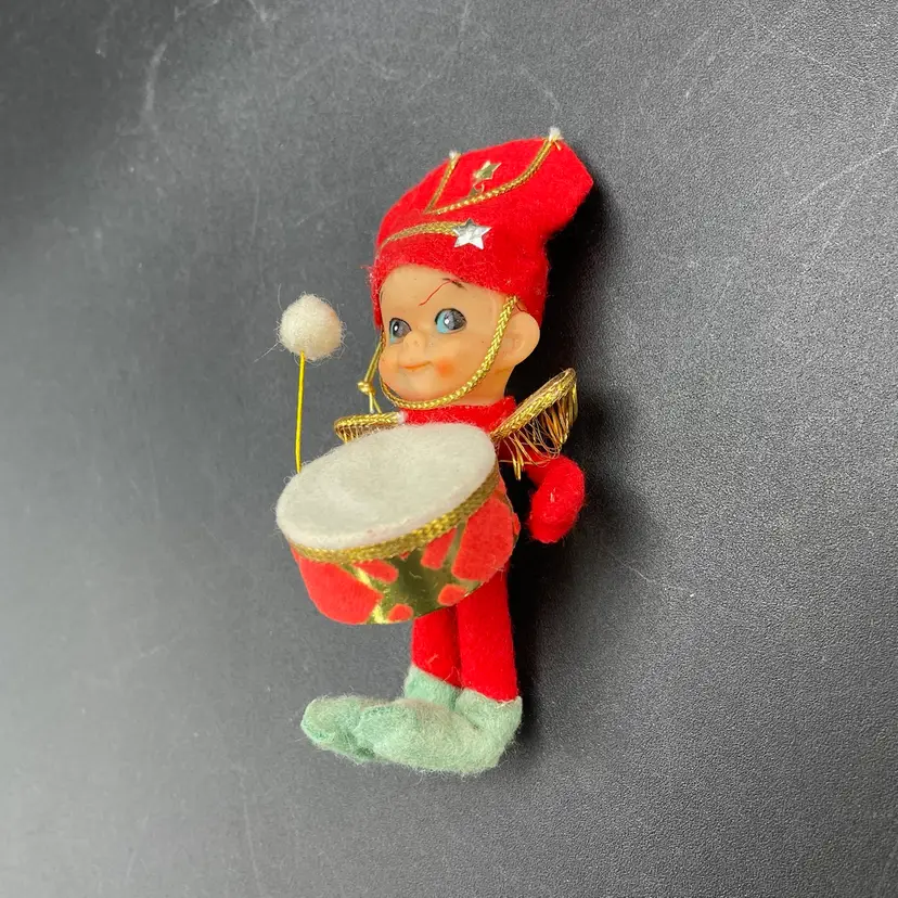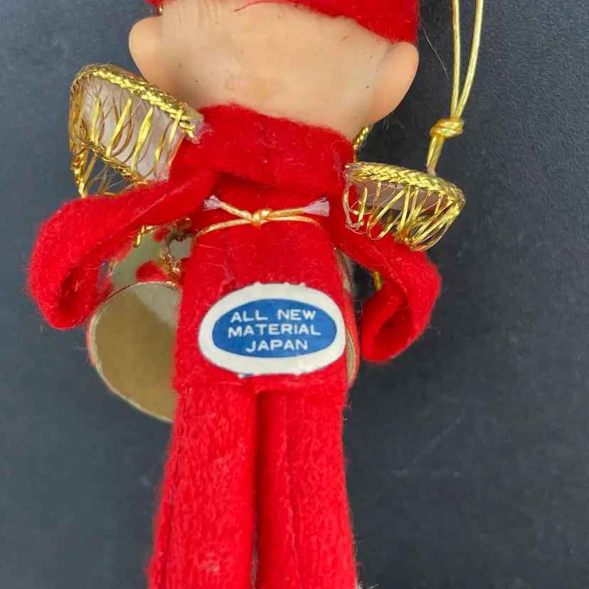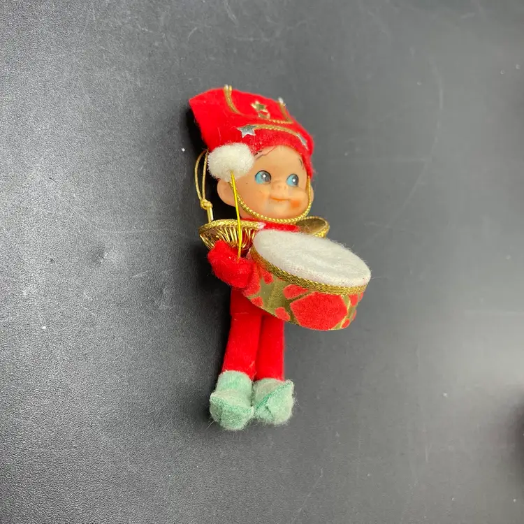 This is a vintage drummer boy hanging ornament. His head is plastic while his body is felt. Made in Japan. Measures approximately 4" long. His face has some marks due to age and use, and a drumstick is missing. Both are shown in pictures. No other major flaws.