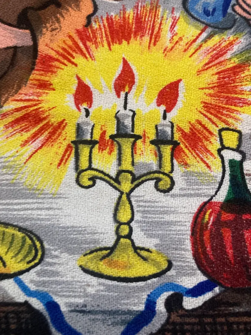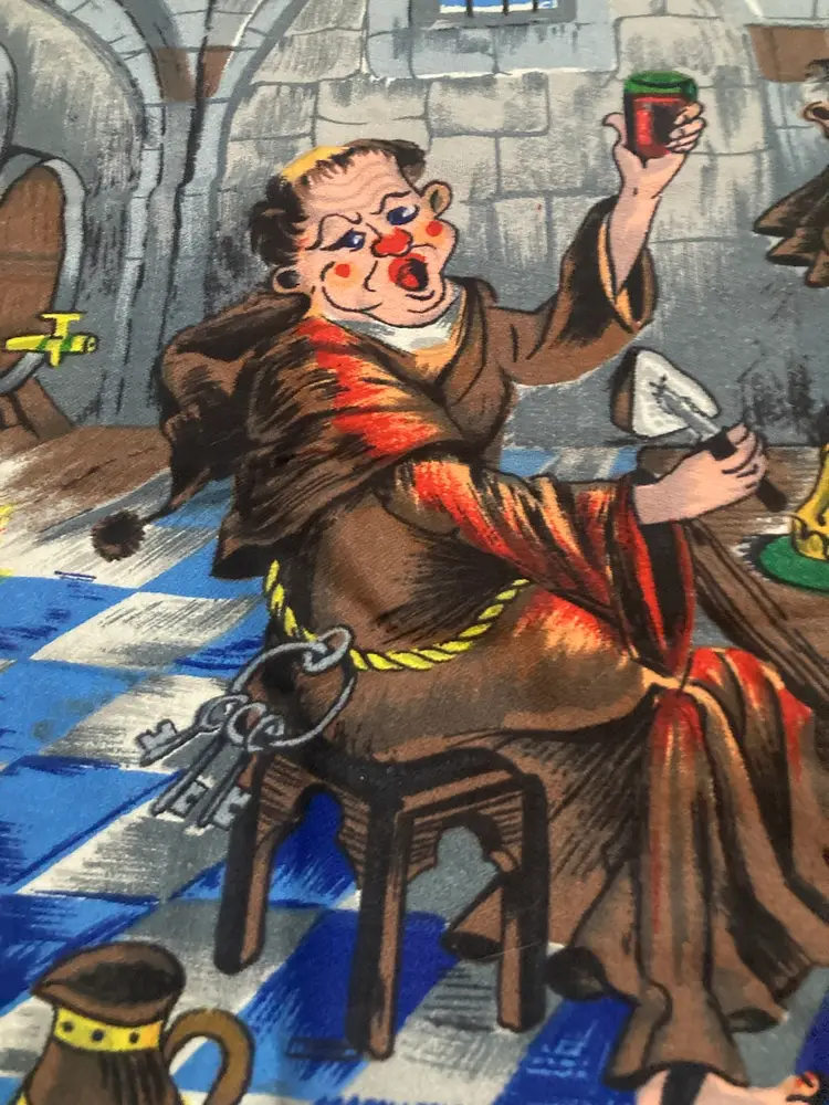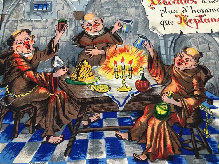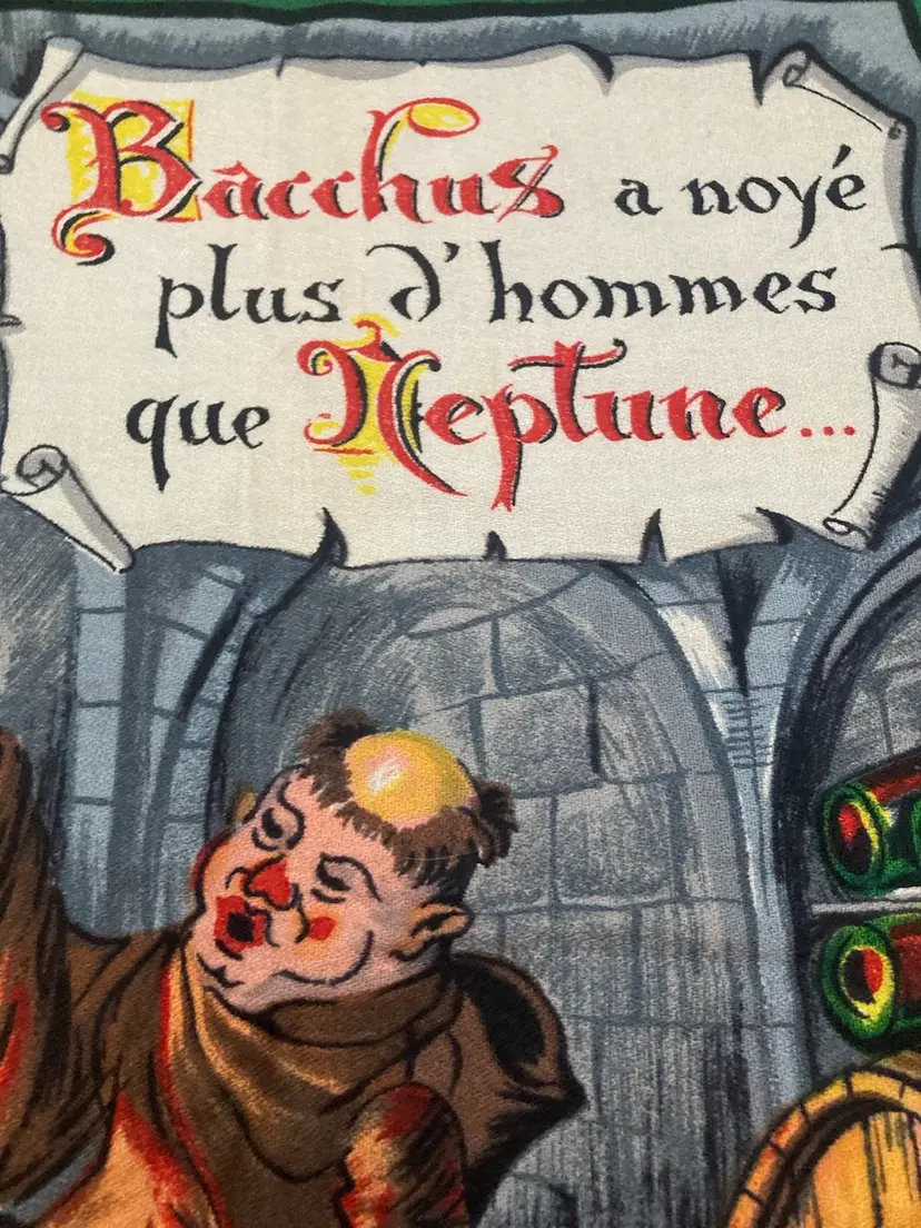 French Tapestry Reads Bacchus a note plus d homes que Neptune something in regards to drowning more than Neptune I believe pictures three monks drinking beer out of barrels with candles lit sitting at a table very bright pretty colors. Ailed measures approximately 28 1/2 x 19”.